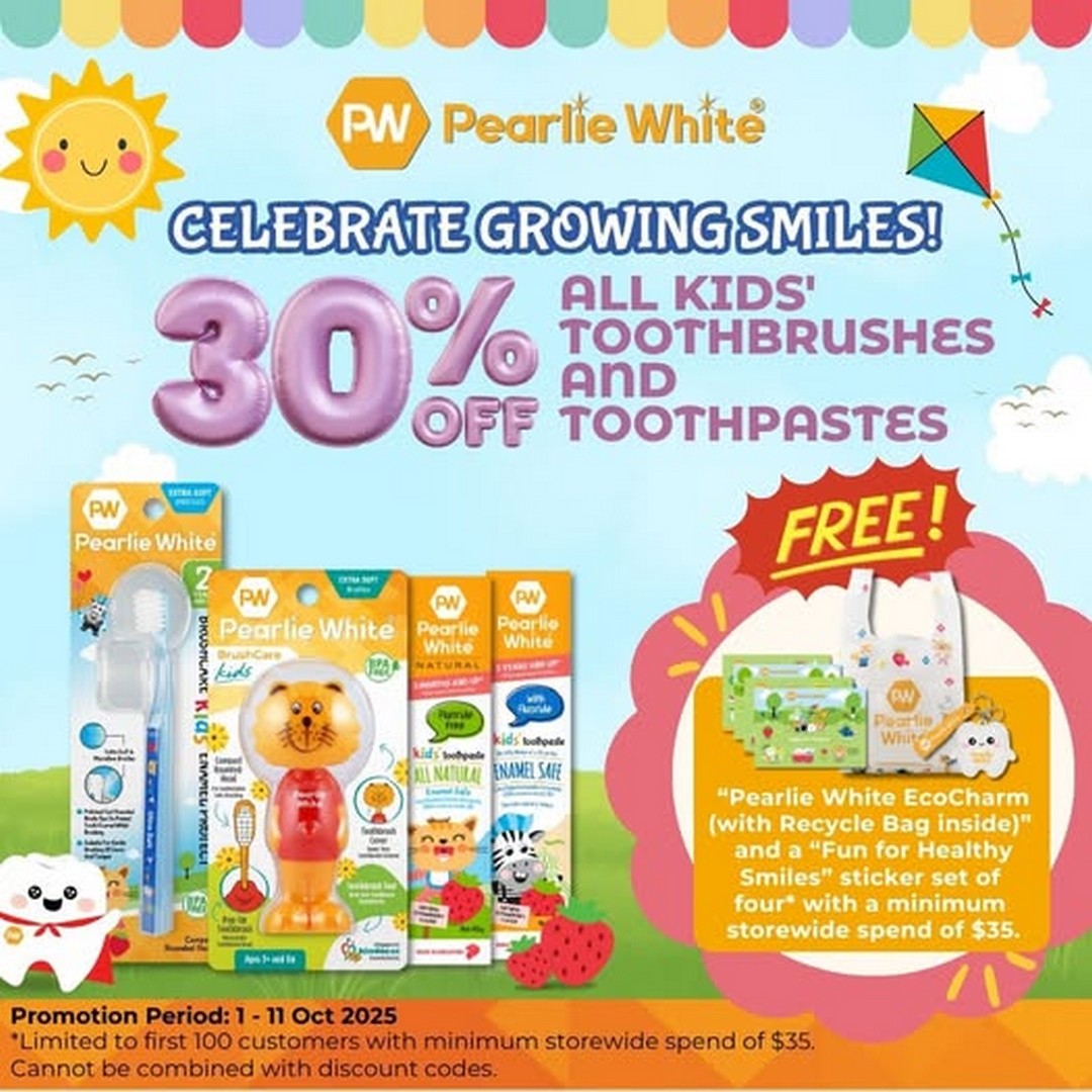 Children’s Day is just around the corner, and Pearlie White is making it extra special for little ones and their families with an irresistible promotion that combines fun and dental care. From 1 to 11 October 2025, Pearlie White is offering 30% off their kids’ toothbrushes and toothpastes, giving parents the perfect opportunity to stock up on oral care essentials while treating their children to products that make brushing teeth a more enjoyable daily routine.
