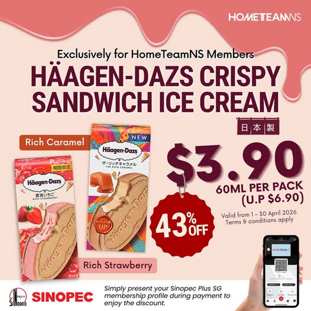 For those who appreciate quality desserts, Häagen-Dazs has long been associated with rich flavours and a luxurious texture. Now, with this limited-time promotion, HomeTeamNS members can enjoy the Häagen-Dazs Crispy Sandwich Ice Cream (60ml) for just $3.90, which is a generous 43% discount off the usual price. This deal is available at Sinopec stations across the island, making it convenient whether someone is commuting, running errands, or simply stopping by for a quick treat.