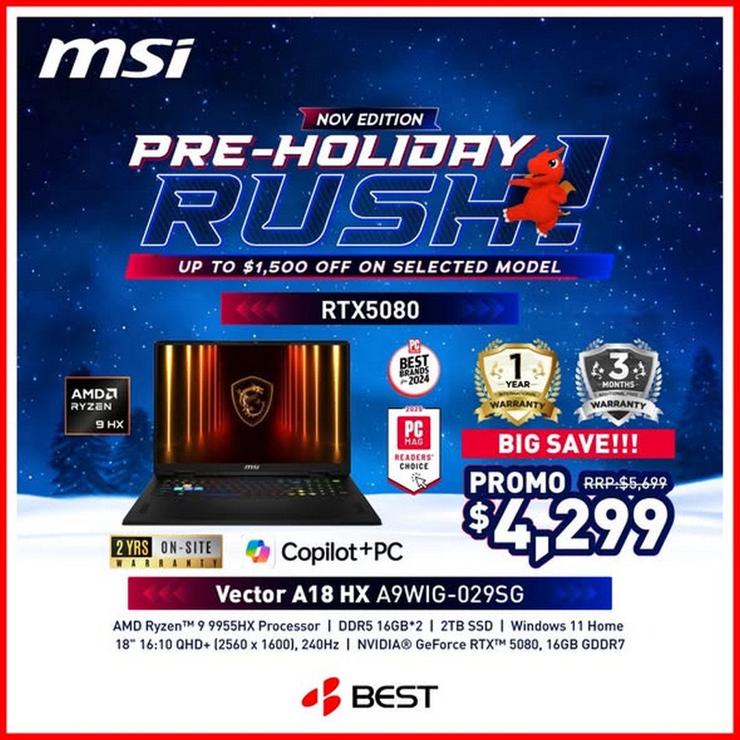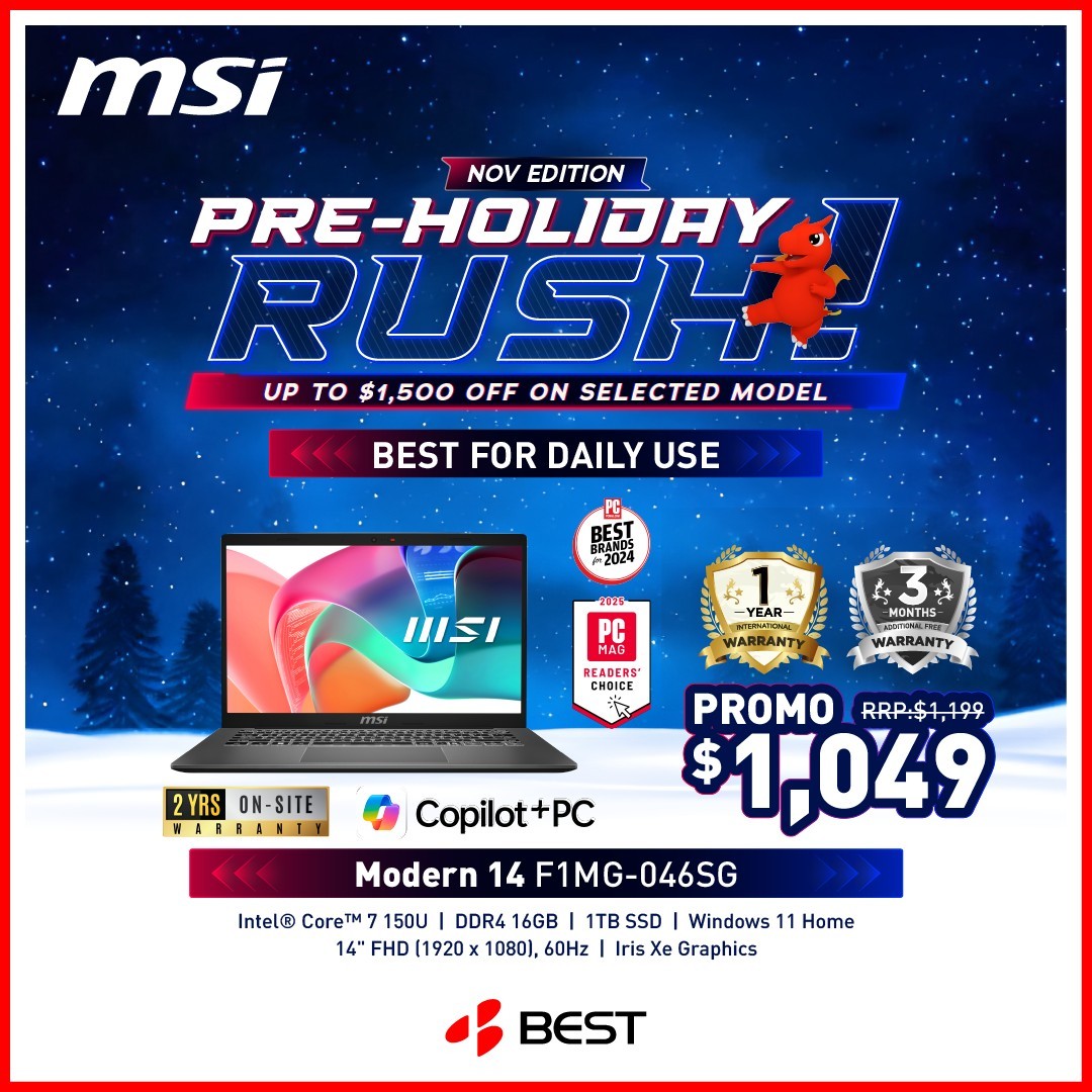 In short, the Pre-Holiday MSI November Deals at BEST Denki Singapore offer more than just savings—they provide a comprehensive package for anyone looking to upgrade their laptop this season. With discounts reaching up to SGD 1,500, bonus warranty coverage, and a range of models catering to different lifestyles and needs, it’s an opportunity that shouldn’t be missed. For anyone planning to enhance their gaming, boost productivity, or invest in a long-lasting laptop, heading to BEST Denki—or visiting their online store—is a decision that combines practicality, value, and peace of mind.