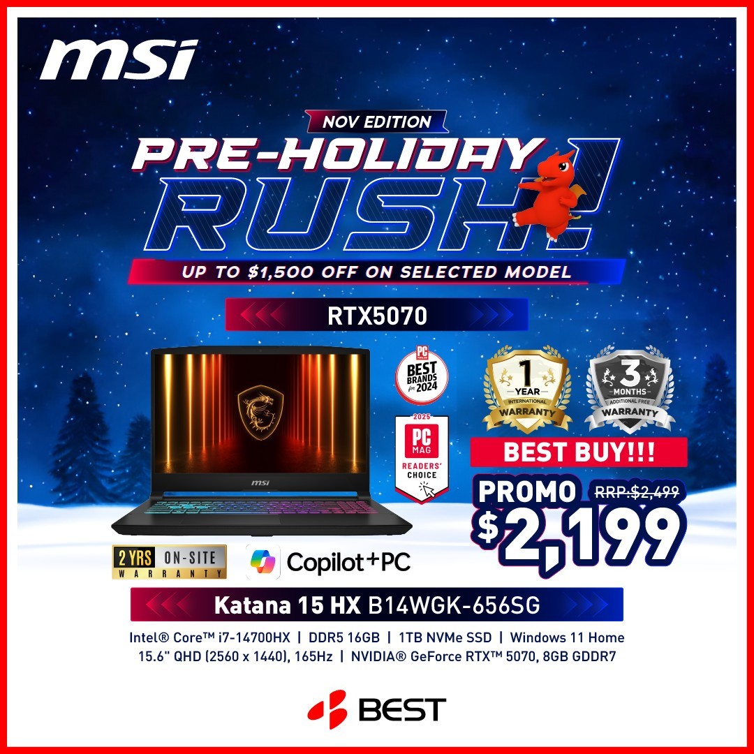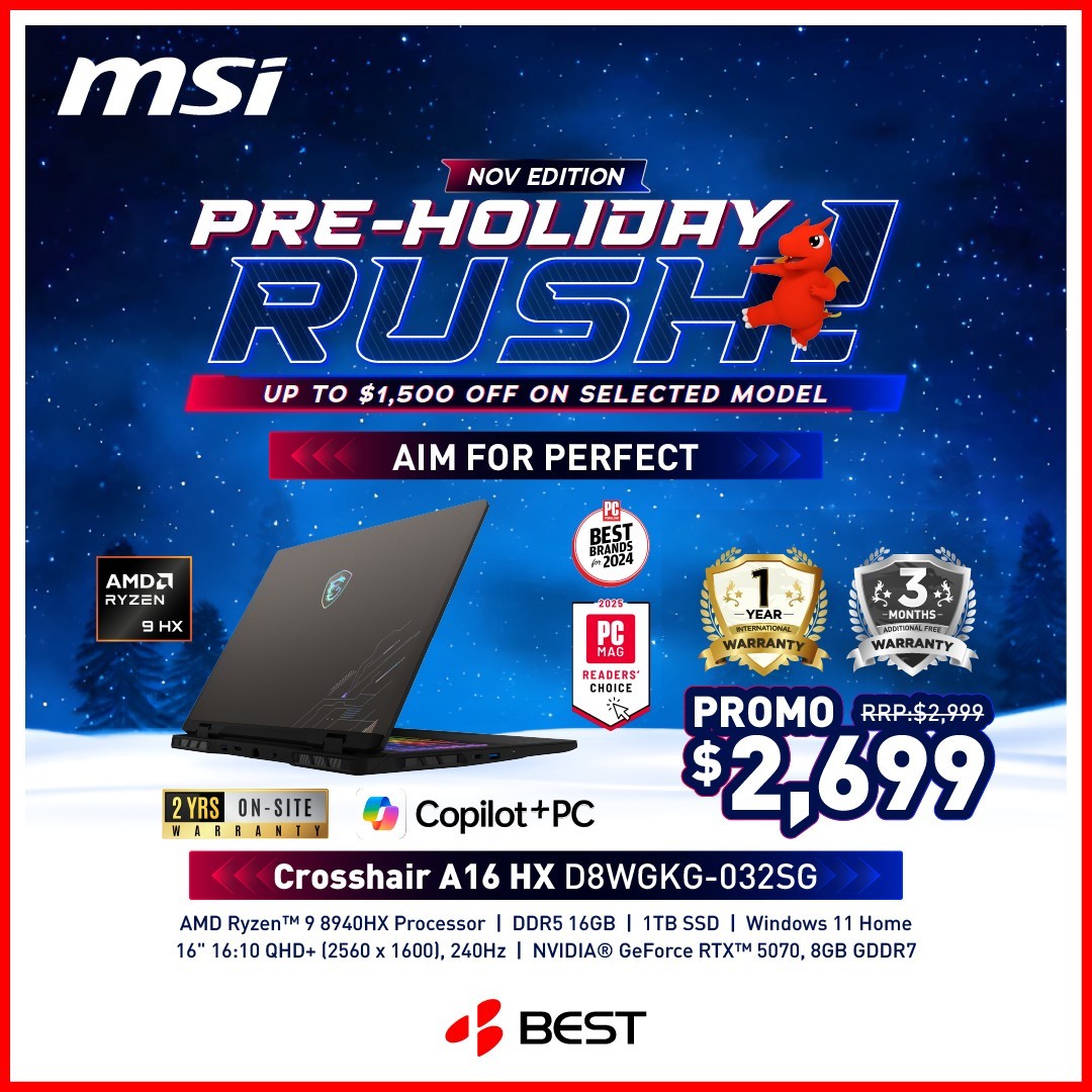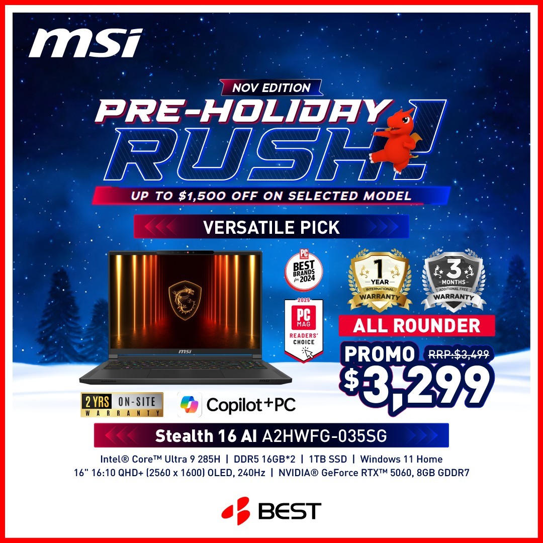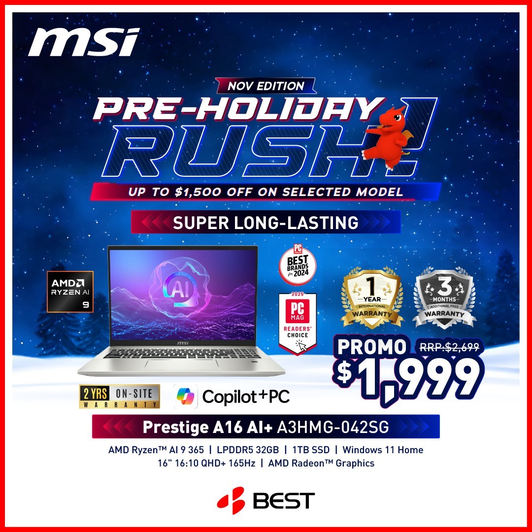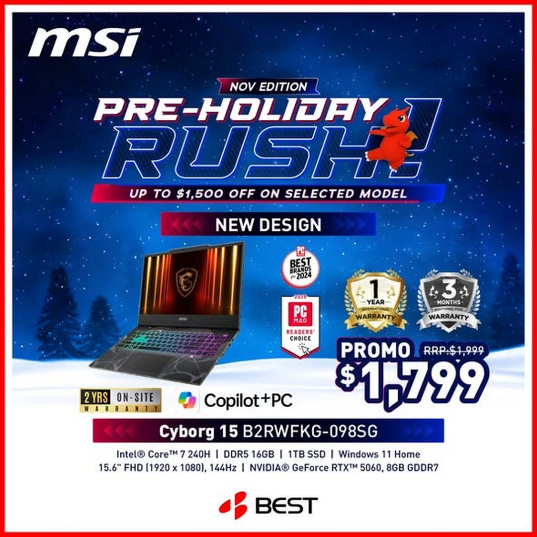 The holiday season is just around the corner, and savvy shoppers know that upgrading tech before the end-of-year rush is the smartest move. BEST Denki Singapore has launched their Pre-Holiday MSI November Deals, giving enthusiasts, professionals, and casual users a golden opportunity to snag high-performance laptops at irresistible prices. Whether you’re looking to upgrade your gaming rig, improve your productivity, or simply treat yourself to a premium device, this promotion is designed to cater to every need—and with savings of up to SGD 1,500, it’s hard to resist.