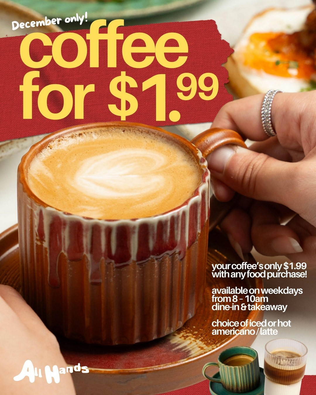 This December, All Hands Cafe is bringing an extra incentive to brighten up weekday mornings with their special $1.99 Morning Brews Promotion. For the entire month, customers can enjoy a hot or iced Americano or Latte for just $1.99 when paired with any food order. Whether you prefer to dine-in and soak in the café’s relaxed ambience or grab a takeaway on the go, this deal is available from 8AM to 10AM on weekdays.