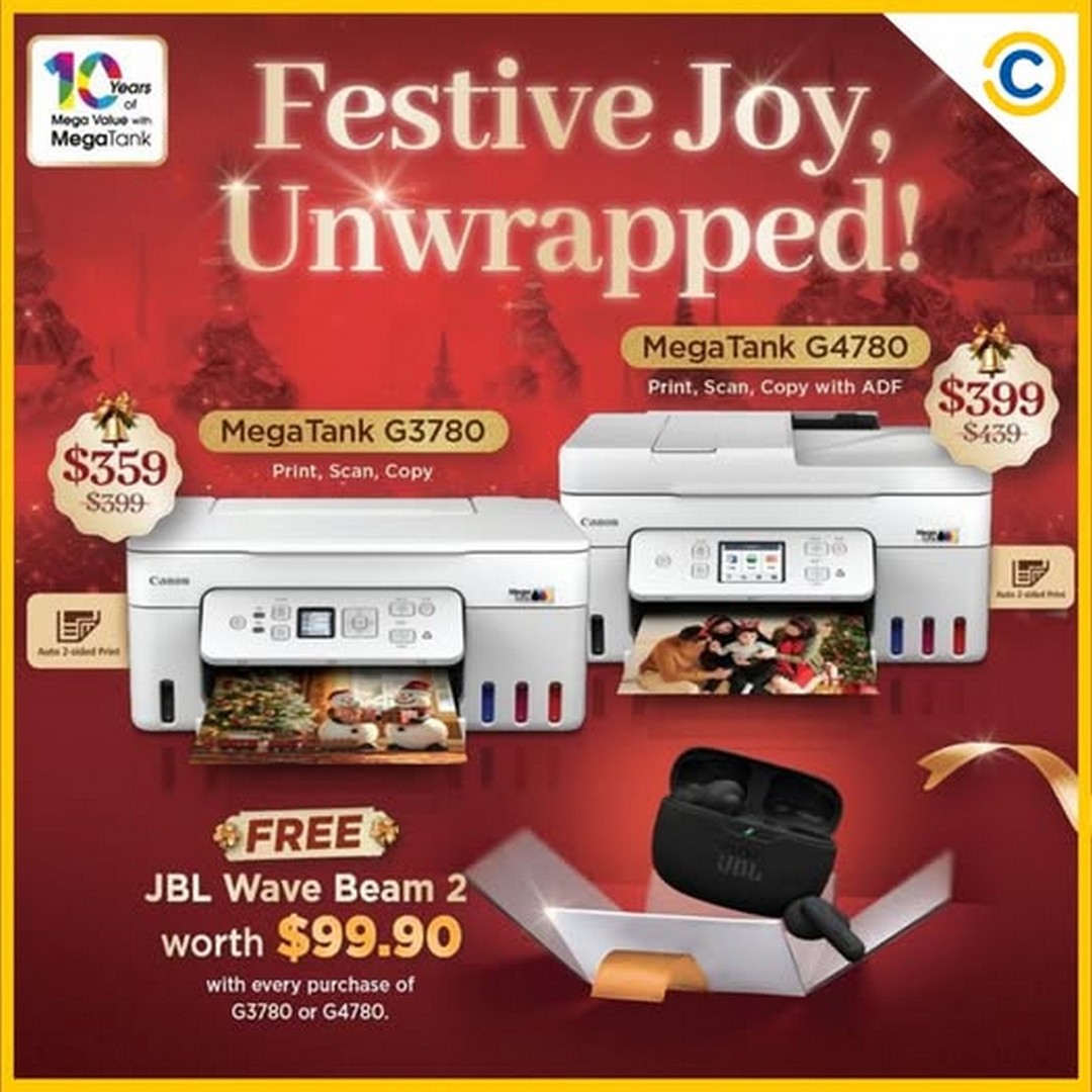 Running from 1 to 31 December 2025, this limited-time deal highlights two popular Canon MegaTank models: the Canon G3780 Wireless Multi-Function Printer and the Canon G4780 Wireless Multi-Function Printer with ADF. To make the offer even more appealing, customers who purchase selected Canon MegaTank printers during this promotional period will receive a free JBL Wave Beam 2 worth $99.90, while stocks last. This is a festive bundle that combines productivity with entertainment, making it one of the more practical yet exciting promotions to consider this December.