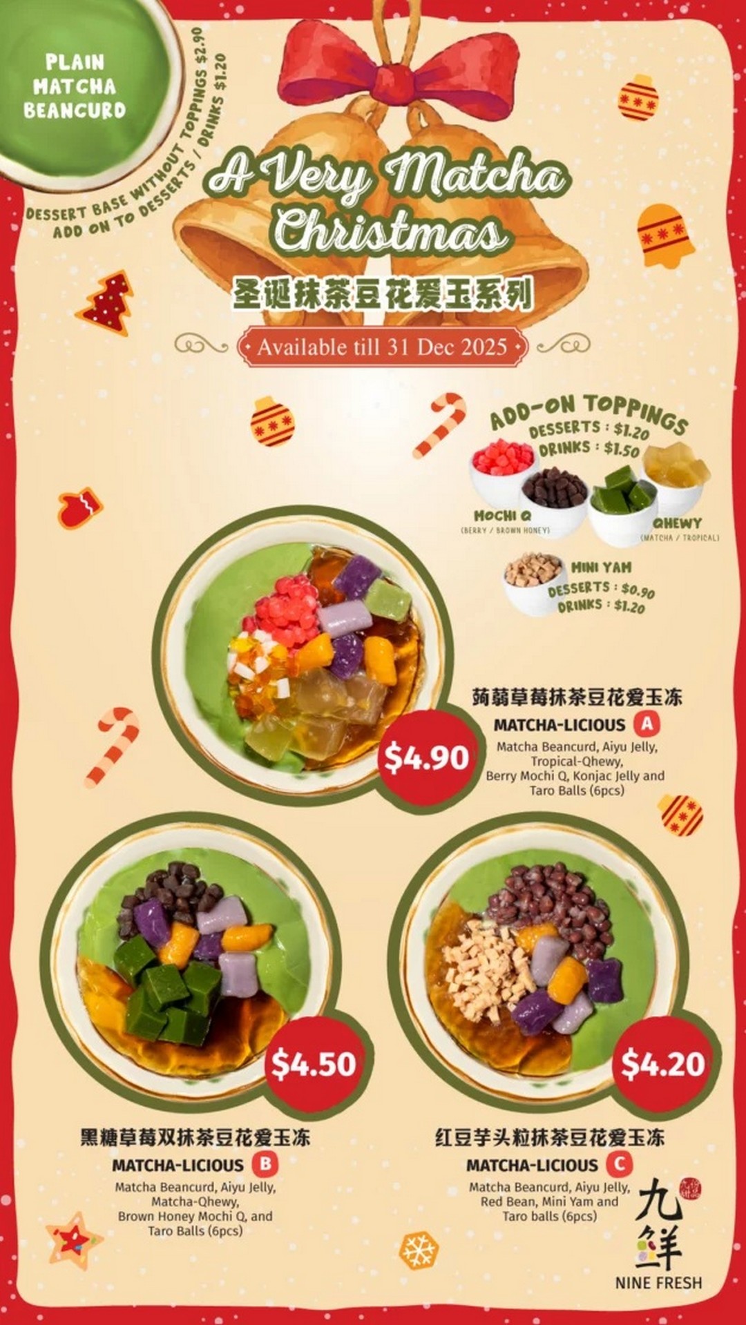 For customers who enjoy a more minimalist approach, Nine Fresh also offers a Plain Matcha Beancurd option. This allows the matcha base to shine on its own while providing the flexibility to customise with add-on toppings. Fans can get creative, choosing from a variety of extras to create their ideal festive bowl.