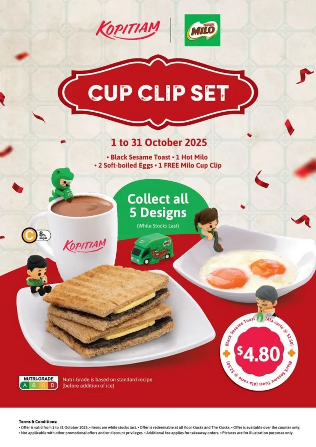 Kopitiam has partnered with MILO to launch an exclusive set that is as delightful as it is affordable. For just $4.80, diners can enjoy a well-loved breakfast combination: Black Sesame Toast, two soft-boiled eggs, and a Hot MILO. While the set itself is already a hearty and satisfying way to start the day, the real treat comes with the addition of a free MILO Cup Clip.