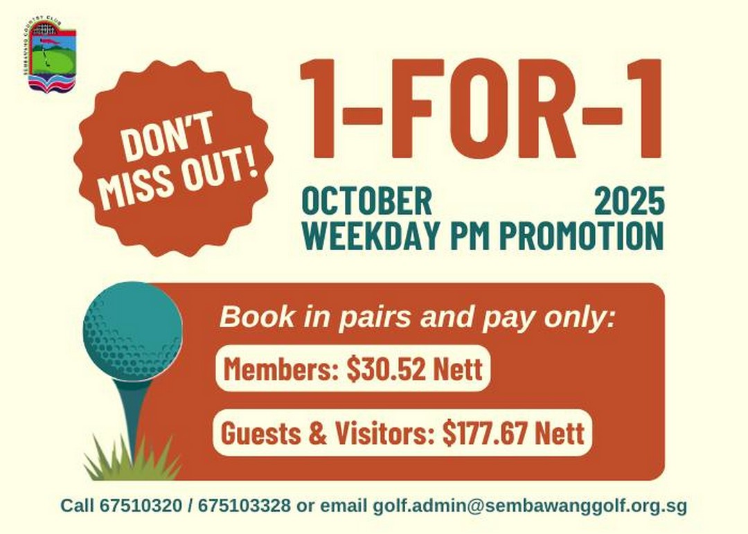 Booking: Call 6751 0320/328 or email golf.admin@sembawanggolf.org.sg (7 days in advance)