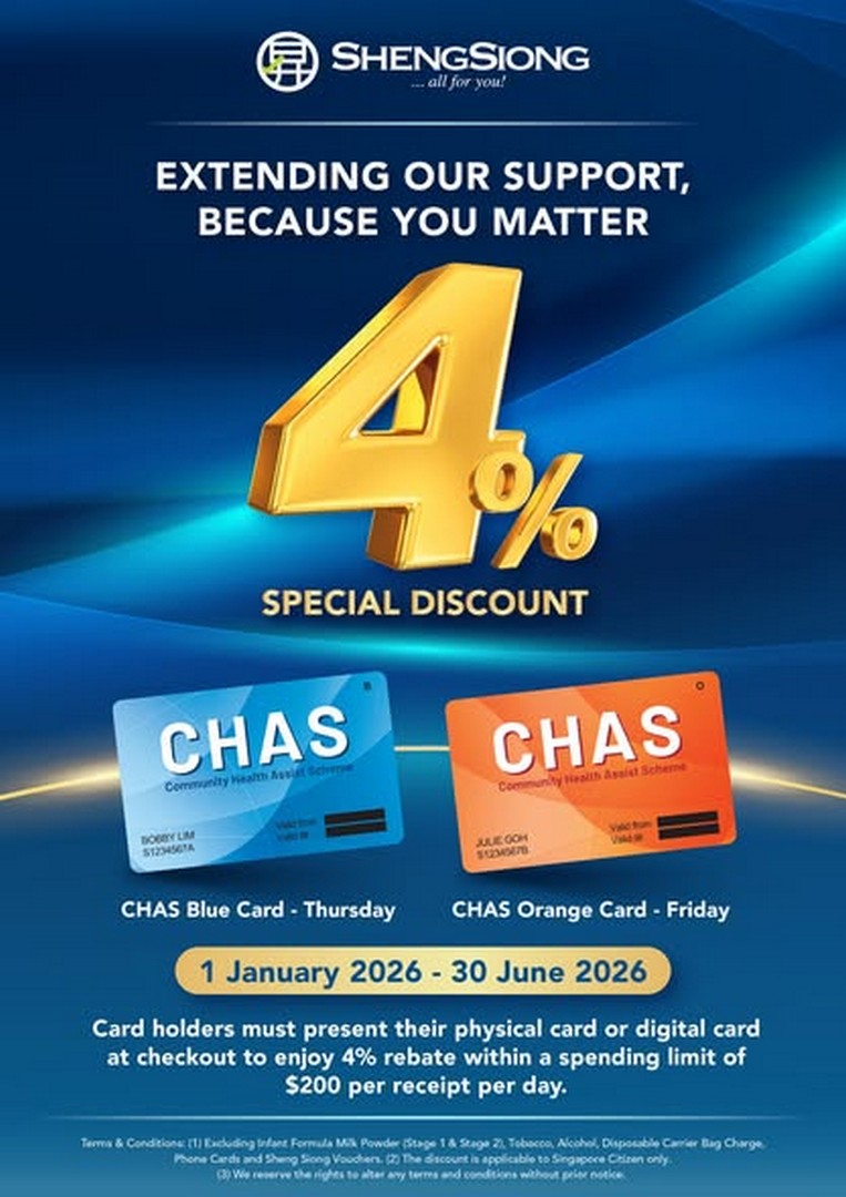 From 1 January to 30 June 2026, Sheng Siong Supermarket is offering all CHAS Orange card holders a 4% discount on their grocery purchases every Friday. This is not a one-off flash deal or a complicated points-based reward system. Instead, it is a straightforward, weekly discount that helps eligible shoppers save consistently on everyday essentials. The promotion reflects Sheng Siong’s continued effort to support the community, particularly those who rely on CHAS benefits, by easing the cost of daily necessities.