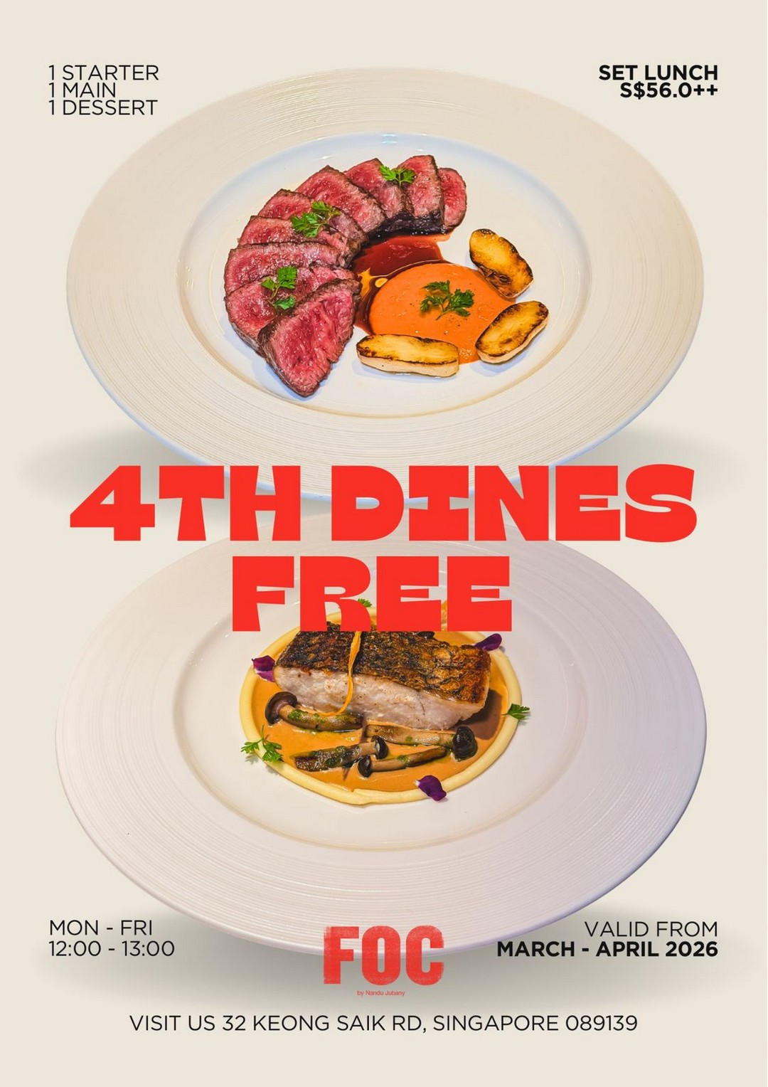 FOC Restaurant has been a beloved destination for food lovers for over a decade, and now, with its fresh new home on Keong Saik Road, it is offering a weekday lunch promotion that is bound to excite diners looking for a little midweek indulgence. From 1 March to 30 April 2026, FOC Restaurant is making weekday lunches more enticing than ever: for every four guests enjoying the 3-course set lunch, one of them dines completely free. It’s a promotion that’s perfect for friends, colleagues, or anyone who wants to treat themselves without stretching the wallet.