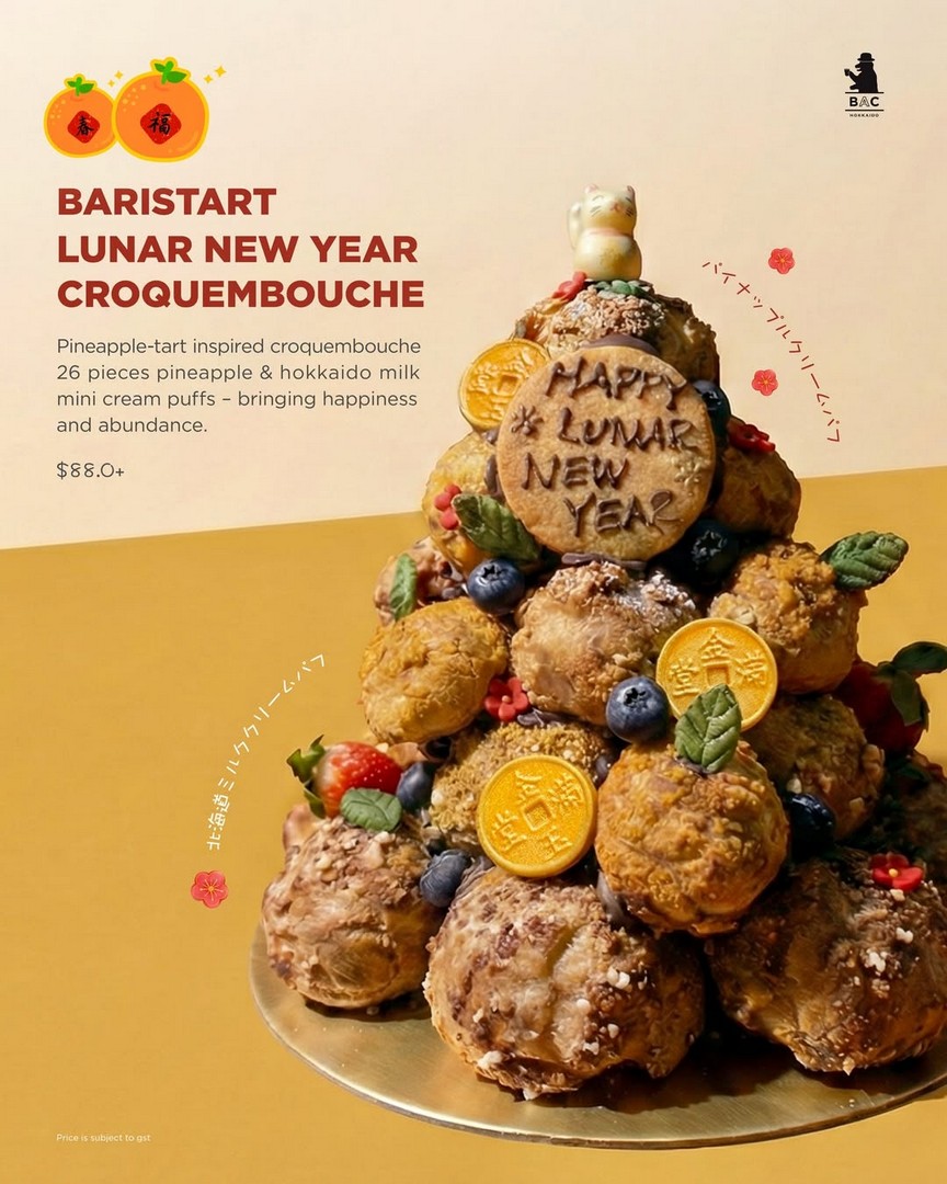 Lunar New Year is the season for family gatherings, festive treats, and symbols of prosperity, and Baristart Coffee has truly stepped up this year with something that promises to be the centrepiece of your celebrations. For those who love indulgent desserts with a twist of tradition, their Special Lunar New Year Croquembouche is a must-try. Priced at $88, this dessert is not just visually stunning but also thoughtfully crafted to bring a touch of sweetness and luck into the new year.