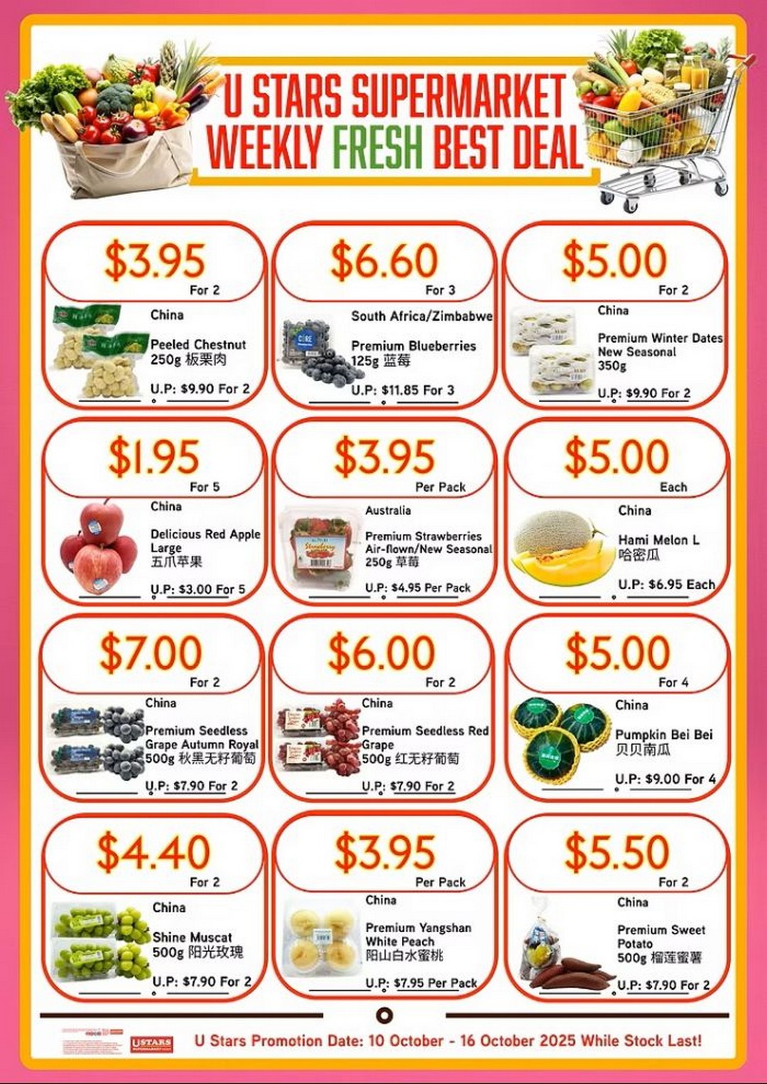 U Stars Supermarket’s Weekly Fresh Best Deal features a mix of imported and locally sourced produce at prices that genuinely surprise. Imagine being able to fill your trolley with a colourful selection of fruits for under $10 — and we’re not talking about basic items either. The deals are impressively generous: