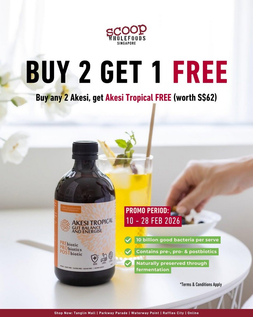 If you’re someone who’s conscious about gut health, loves wellness products, or simply enjoys getting a great deal, Scoop Wholefoods has just the promotion to brighten up your February. From 10 February to 28 February 2026, Scoop Wholefoods is offering an exclusive Buy 2, Get 1 Free deal on their Akesi range – and the free item is the highly sought-after Akesi Tropical, worth S$62.