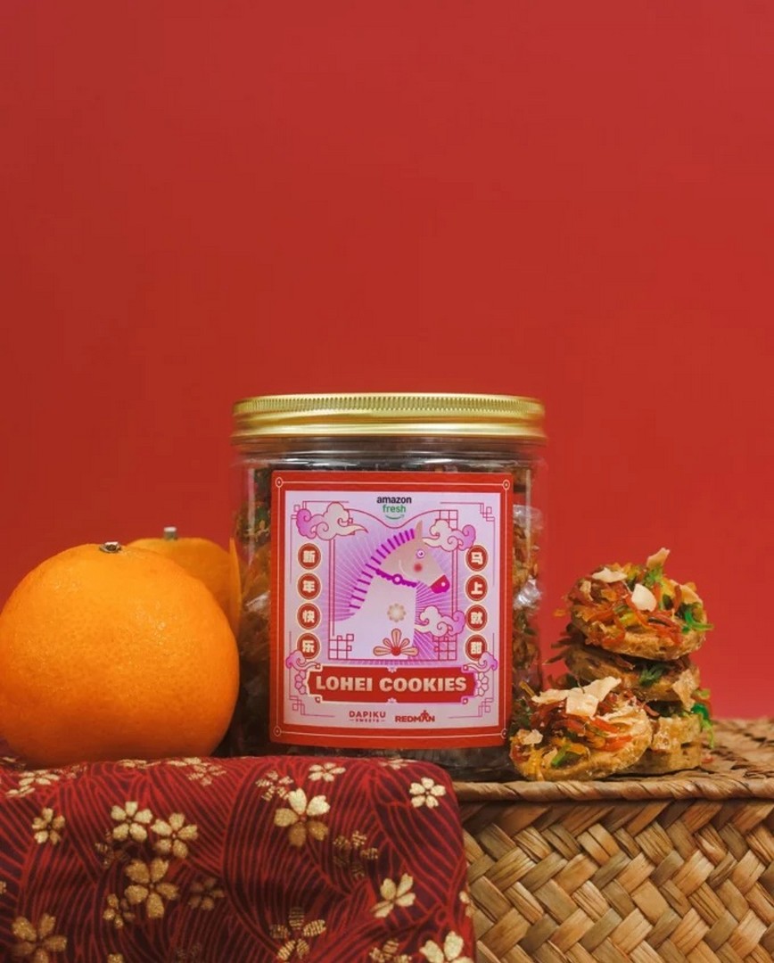 Rather than being tied to a single meal or table, the Lo Hei Cookie takes the essence of yusheng—its bright flavours, textures, and symbolic ingredients—and compresses it into a snackable, shareable treat. This innovative creation is the result of a collaboration between Amazon Fresh, local bakery Dapiku Sweets, and renowned baking supplier Phoon Huat, combining culinary creativity with festive charm.