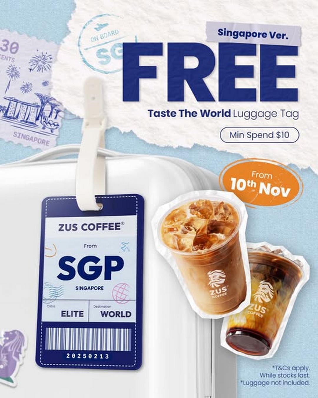 Don’t miss this chance to indulge your love of coffee and collect a unique memento at the same time. Head to the ZUS Coffee App, choose your pick-up outlet, spend a minimum of $10 on any handcrafted drinks, and let the free Taste the World Luggage Tag accompany you on your next coffee adventure.