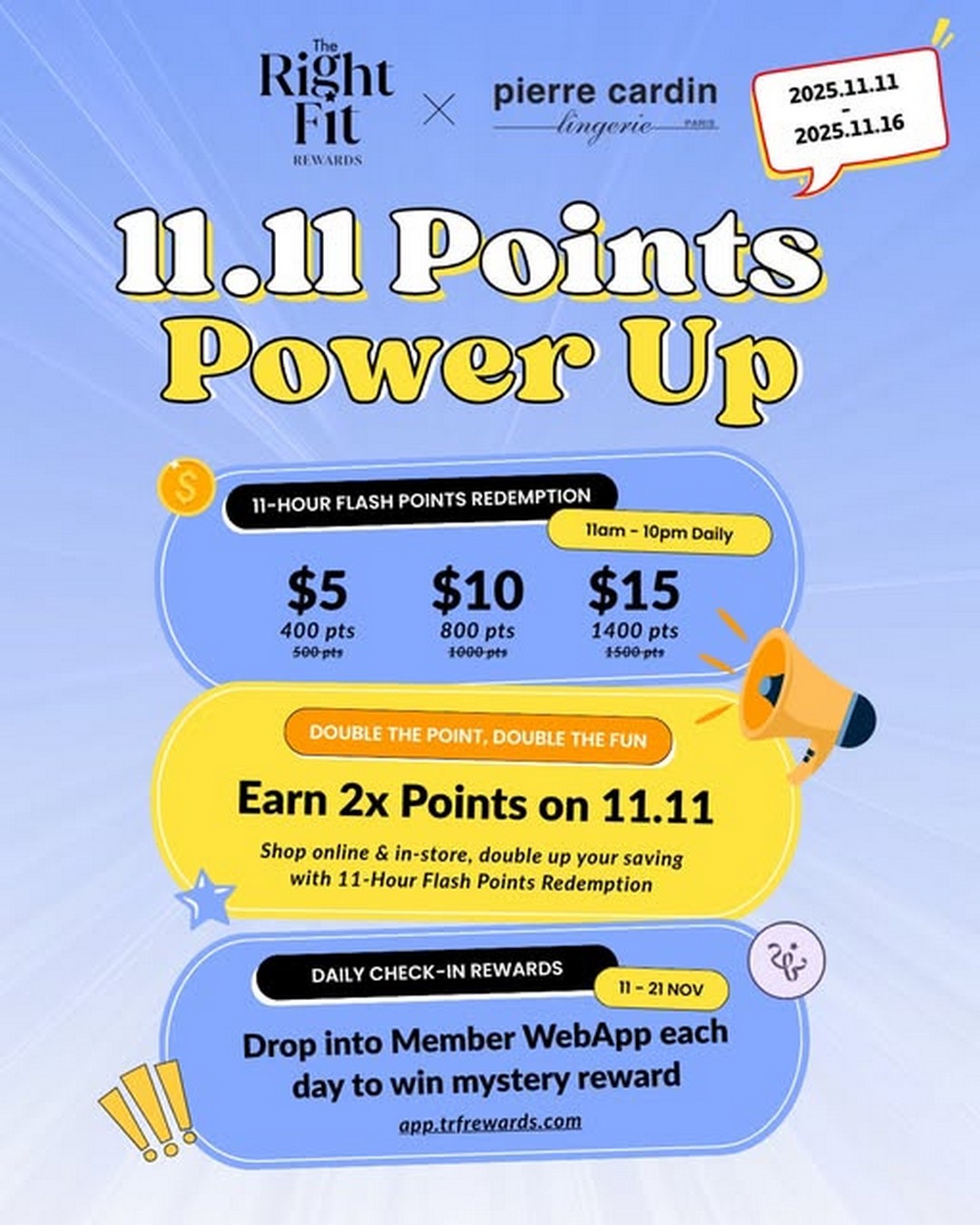 If there is one time to treat yourself to something special, it is now. Pierre Cardin Lingerie Singapore is turning the 11.11 shopping period into an exciting opportunity for their members with the Right Fit Rewards X Pierre Cardin Lingerie “11.11 Points Power Up” campaign. Designed to make your lingerie shopping experience both rewarding and affordable, this promotion is a must-visit for anyone who loves quality, style, and smart savings.