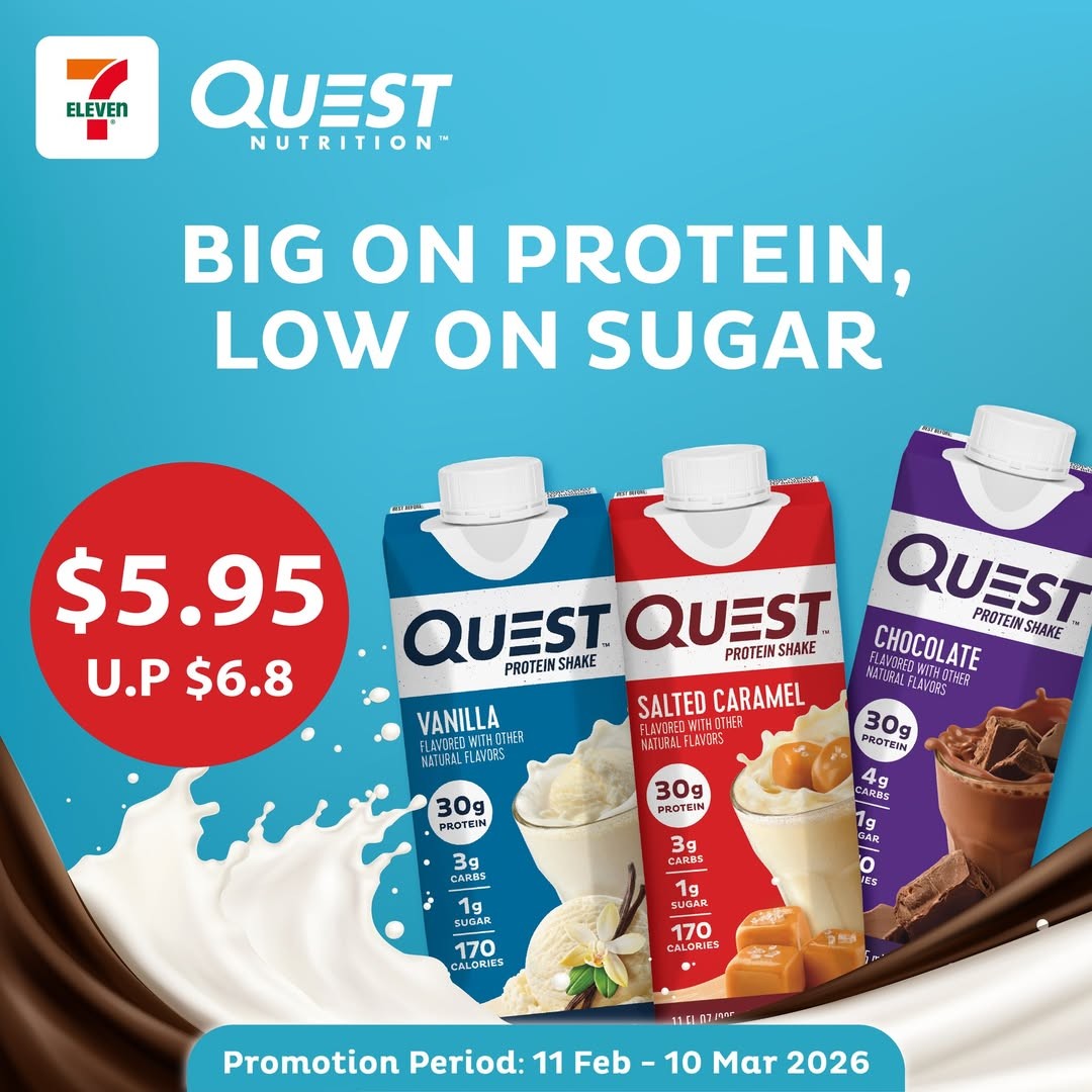 For those who are constantly on the move but still conscious about their fitness and nutrition, 7-Eleven Singapore has a deal that is hard to overlook. From 11 February to 10 March 2026, 7-Eleven is offering the popular Quest Protein Shake at a promotional price of $5.95, down from the usual $6.80, giving customers an immediate saving of 13%. It might not seem like a massive discount at first glance, but when combined with convenience and quality, it becomes an unbeatable grab for fitness enthusiasts and busy individuals alike.