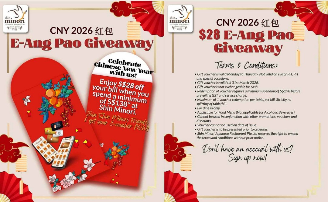 In conclusion, Shin Minori’s CNY 2026 E-Ang Pao promotion offers more than just a discount. It’s an invitation to celebrate the festive season with high-quality Japanese cuisine, share meaningful moments with family and friends, and enjoy a restaurant experience that feels special. With $28 OFF a minimum spend of $138, diners can explore more dishes, indulge in favourites, and enjoy the festive atmosphere without overspending. For anyone in Singapore who loves Japanese food or is looking for a way to celebrate Chinese New Year in style, this promotion is an opportunity not to be missed.