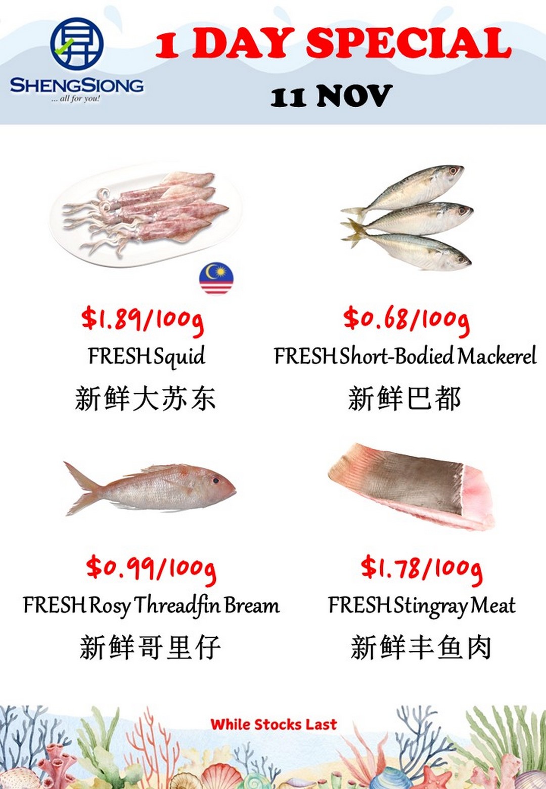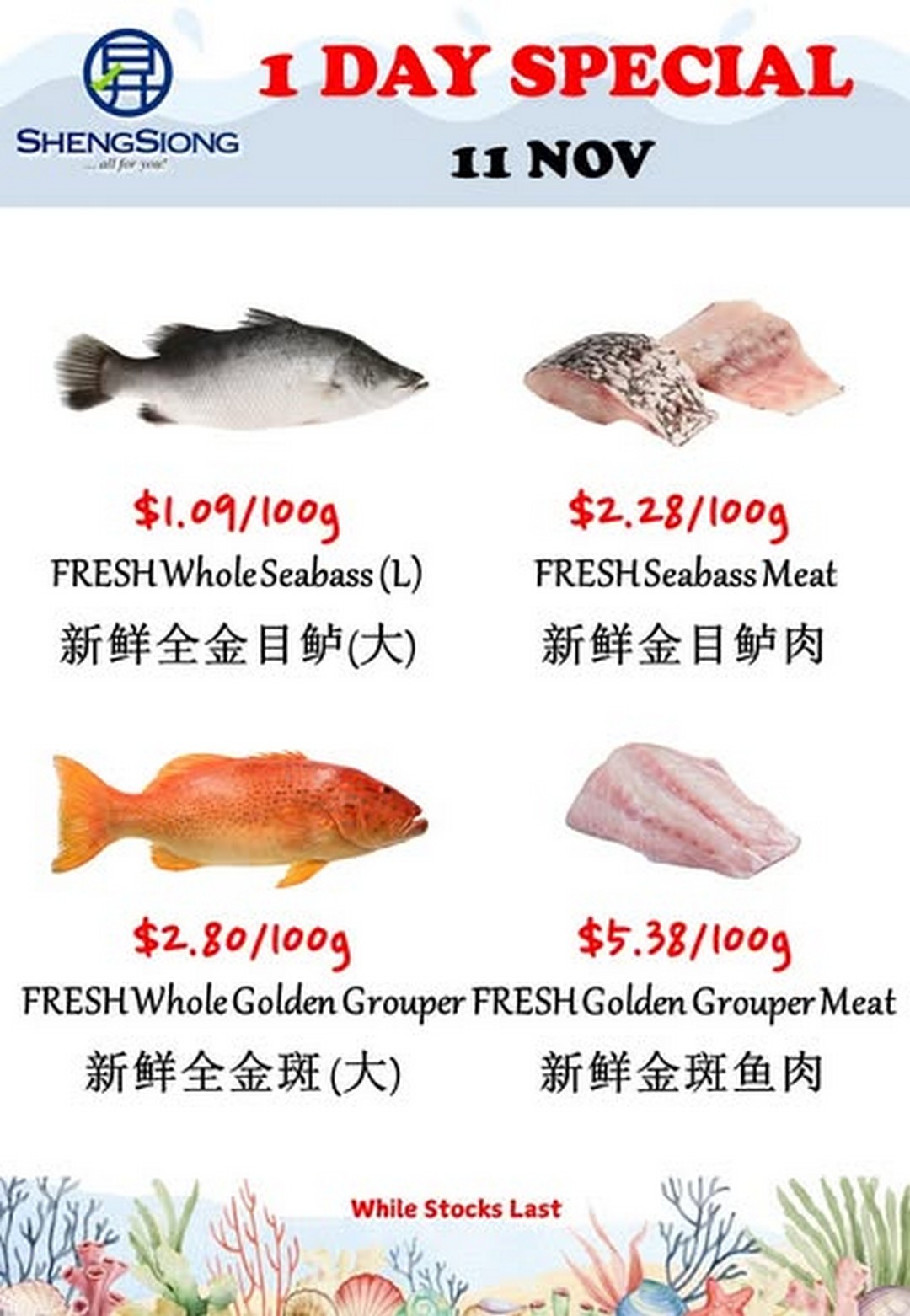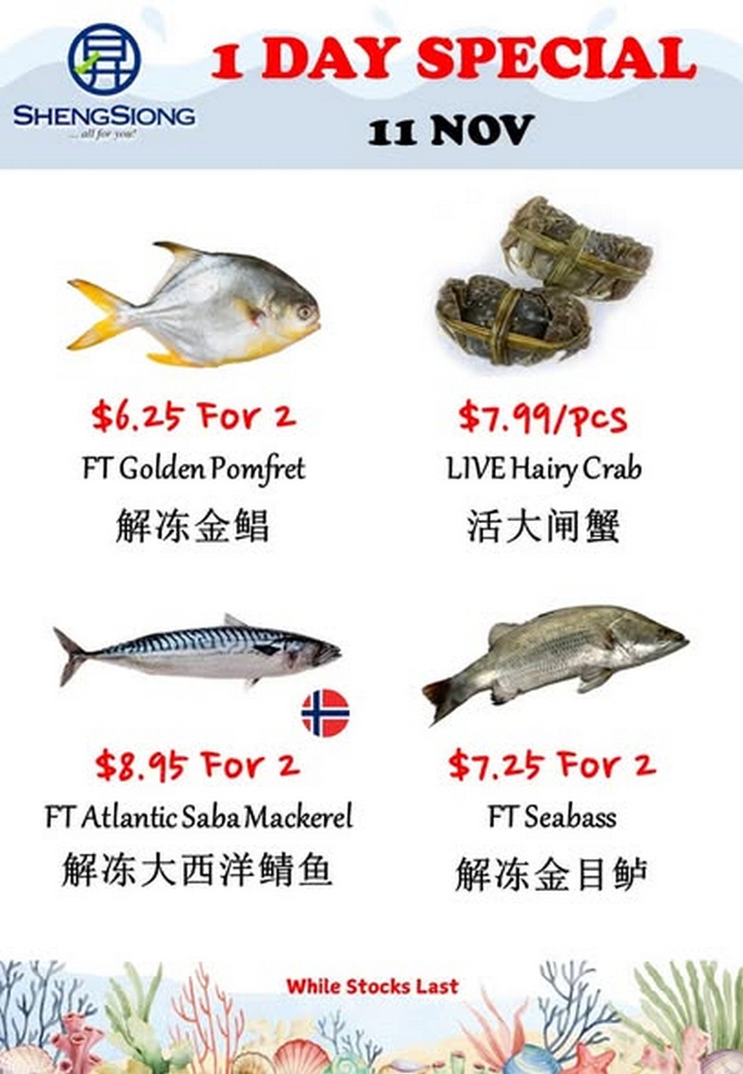If fresh seafood is on your shopping list, there’s no better time to head to Sheng Siong than during this special promotion on 11 November 2025. Shoppers will find a selection of high-quality seafood at attractive prices, perfect for family meals, entertaining, or simply enjoying the pleasure of cooking with the freshest ingredients.
