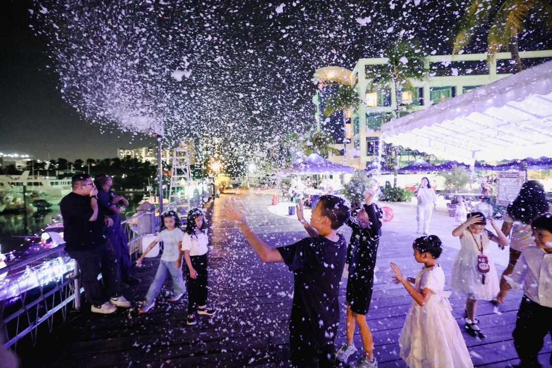 One of the highlights many visitors look forward to is the “snowfall” experience. While it is not real snow, it brings an element of winter wonder that Singapore’s climate normally does not allow. For many, especially younger children, this is one of the most memorable parts of the evening. Standing under gentle “snowfall” next to illuminated yachts feels like stepping briefly into a dreamy holiday postcard.