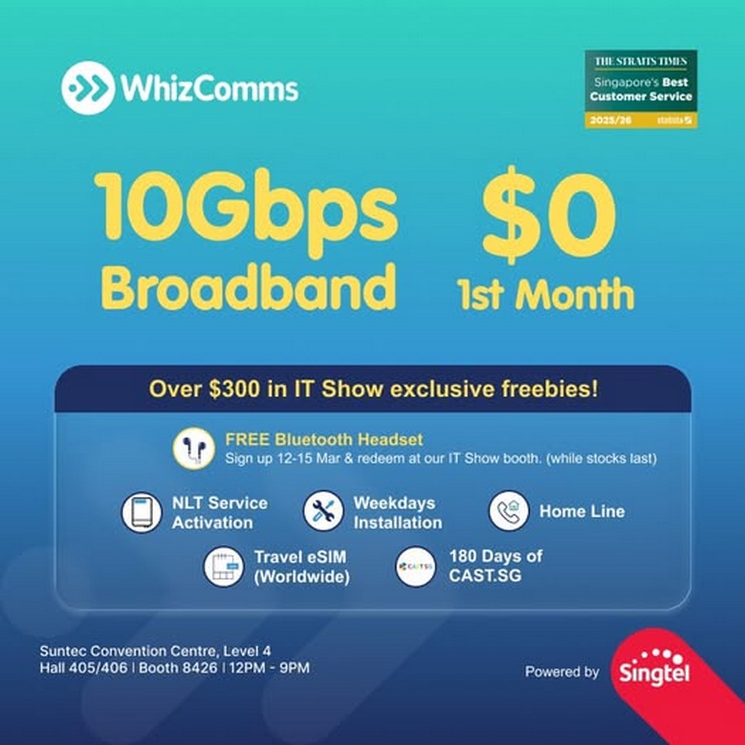 Location-wise, the setup is straightforward. Attendees can head to Suntec Convention Centre, Level 4, Hall 405/406, Booth 8426 between 12PM and 9PM daily from 12-15 March 2026. The booth is strategically positioned, making it easy for anyone attending the IT Show to locate and access WhizComms’ offers. With the IT Show drawing crowds from across Singapore, this is a prime opportunity to combine the excitement of exploring the latest tech with the practical advantage of securing a broadband plan that delivers both performance and value.