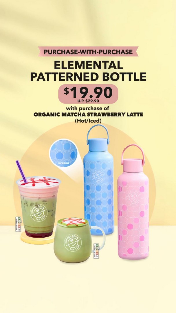 To qualify for this promotion, all customers need to do is purchase The Coffee Bean & Tea Leaf’s latest Organic Matcha Strawberry Latte. The combination is perfect – the rich, earthy matcha blends seamlessly with the sweet, fruity notes of strawberry, creating a drink that’s both indulgent and refreshing. By pairing it with the Elemental Patterned Bottle, customers not only enjoy a satisfying beverage but also receive a practical and stylish accessory at a significantly reduced price.
