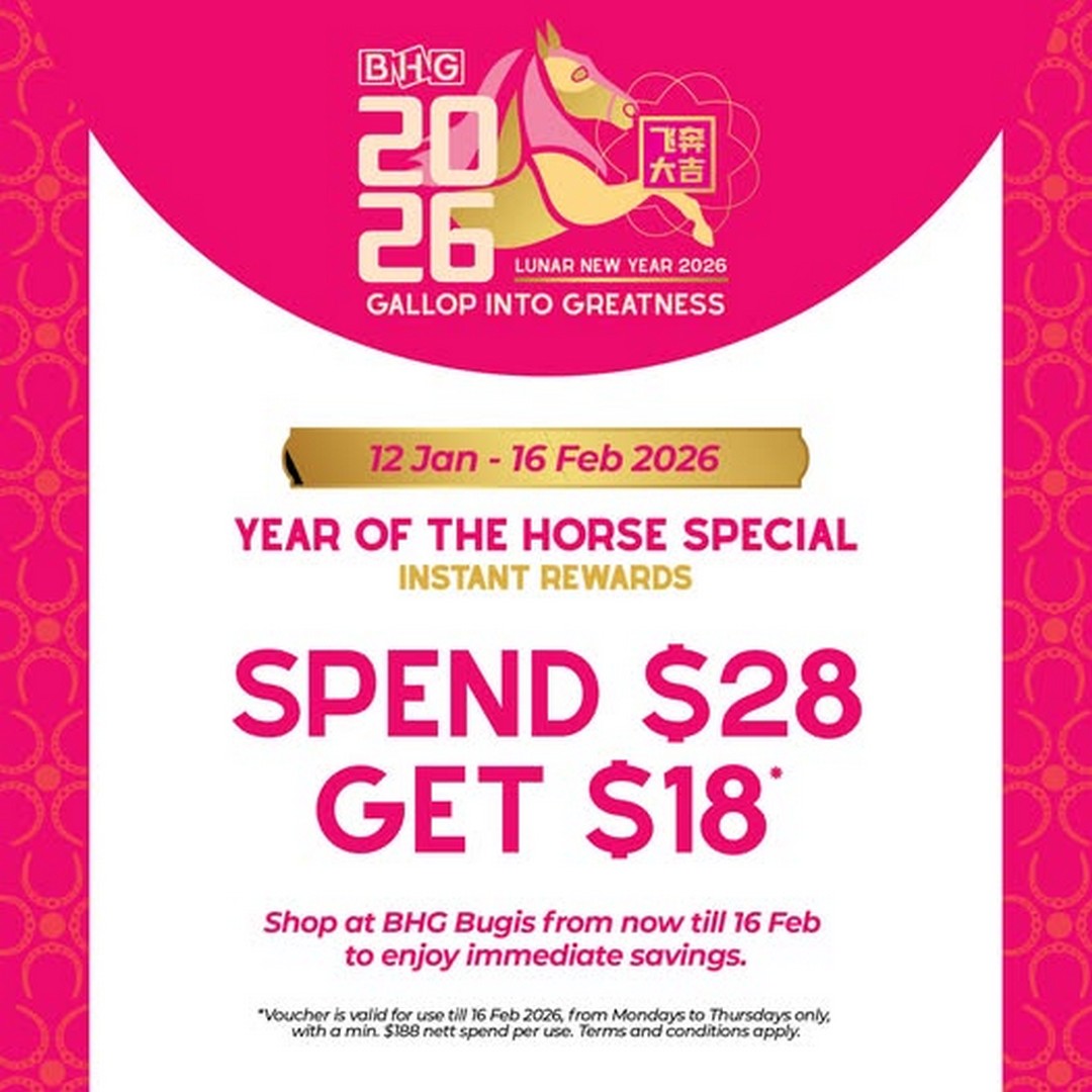 As always, terms and conditions apply, and shoppers are encouraged to check in-store or online for full details before making their purchases. With its accessible spend requirement, useful voucher reward, and generous promotional period, this Year of the Horse deal at BHG Bugis is certainly worth considering for festive shoppers looking to make their dollars go further.