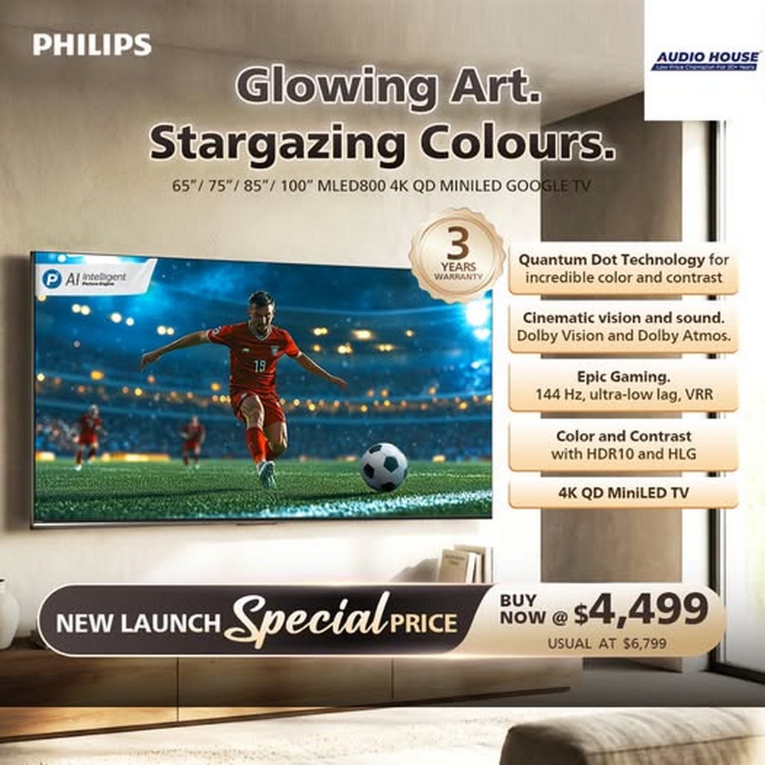 For those who have always dreamt of bringing the cinematic experience into their own living room, Audio House Singapore has just made that dream more achievable with their latest promotion on the Philips MLED 800 Series. This isn’t just another TV sale—it’s an opportunity to completely elevate home entertainment. From blockbuster movies to the thrill of live sports, this is a viewing upgrade that makes every scene more vibrant, immersive, and realistic.