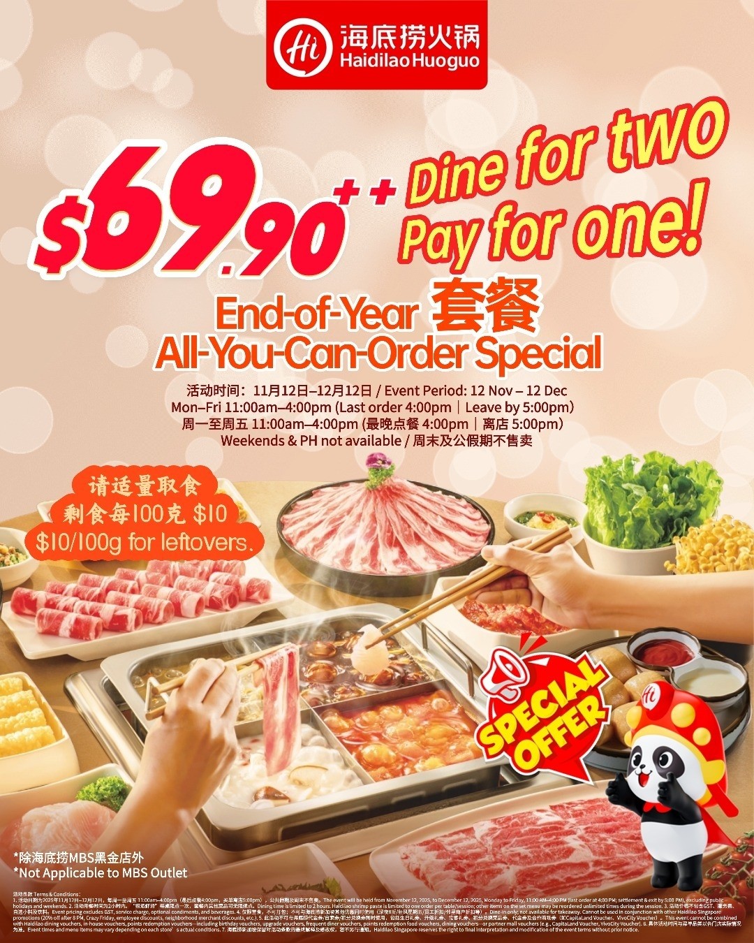 As the year winds down, there’s no better way to treat yourself and a friend than with a hearty hotpot feast, and Haidilao Singapore has made it irresistible. From 12 November to 12 December 2025, the renowned hotpot chain is offering an “All-You-Can-Order” deal for two diners at just $69.90++ — essentially giving diners the chance to enjoy a feast for two while only paying for one.
