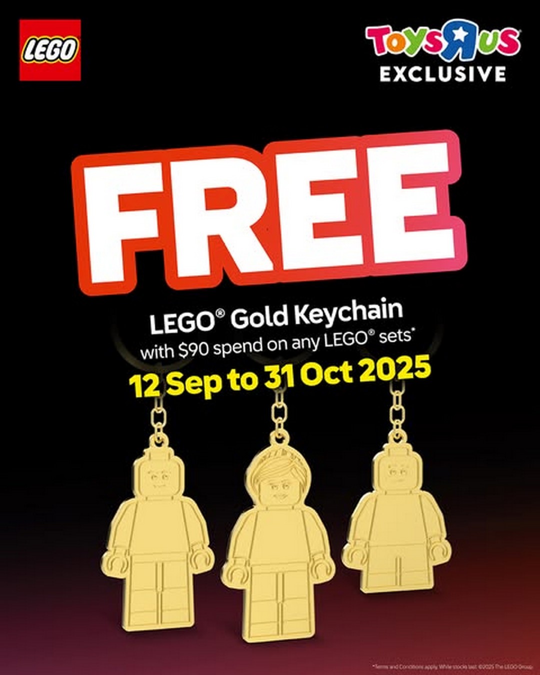 In conclusion, the LEGO® Gold Keychain promotion at Toys”R”Us Singapore from 12 September to 31 October 2025 is a deal worth chasing. It combines the excitement of LEGO® building, the charm of limited-edition collectibles, and the joy of instant rewards. Whether for personal collection, family fun, or gifting purposes, this promotion delivers value and enjoyment in equal measure. Don’t miss out on the chance to collect the whole LEGO® Gold Keychain family – visit Toys”R”Us Singapore, make your $90 LEGO® purchases, and start building your exclusive keychain collection today.