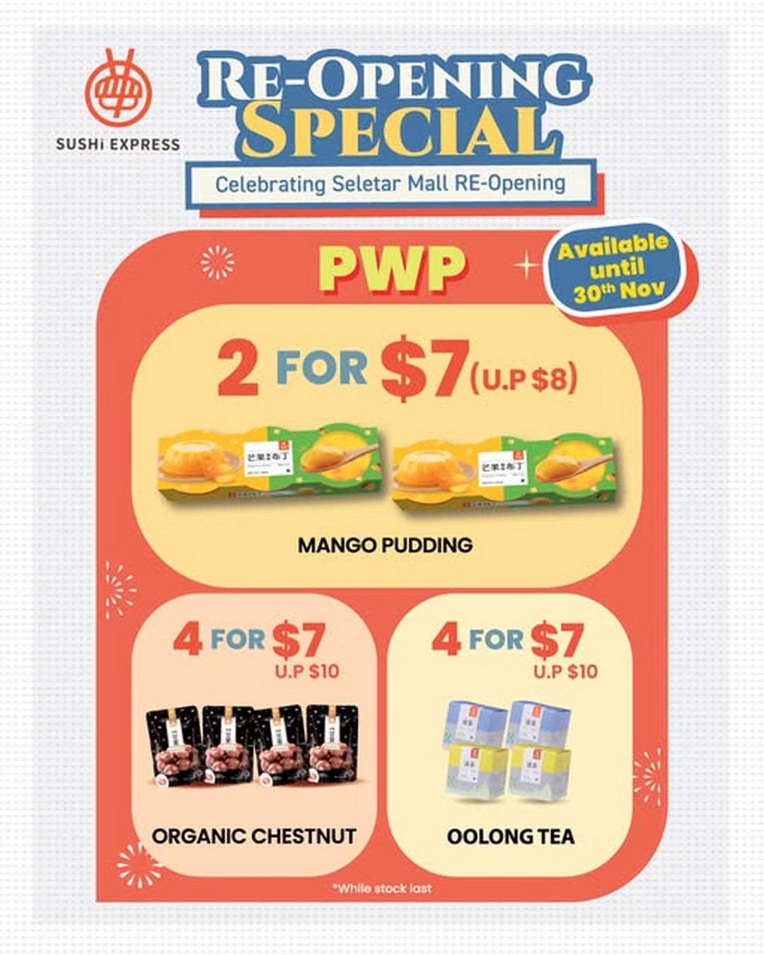 Don’t miss out—these deals are only available until 30 November 2025 and while stocks last. Whether you’re a long-time fan or a curious foodie, Sushi Express’s Seletar Mall outlet promises a treat-filled visit that is both enjoyable and affordable.