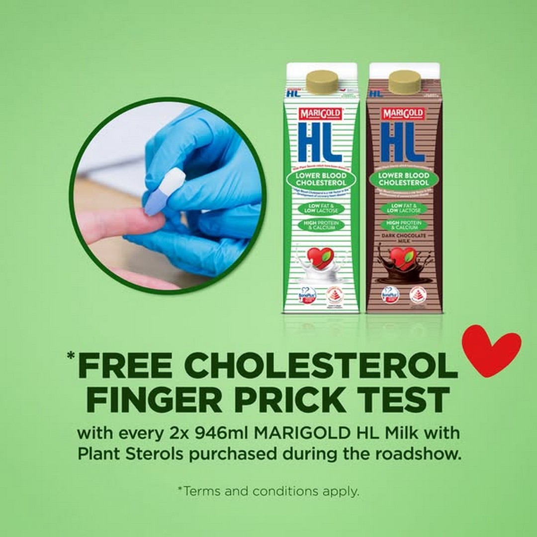 From 13 September to 5 October 2025, MARIGOLD HL Milk is offering a FREE cholesterol prick test at various locations across Singapore. What makes this offer even more attractive is that participants only need to purchase 2 packs of 946ml MARIGOLD HL Milk with Plant Sterols at the roadshow to qualify. Not only do they get a high-quality milk product designed to support healthy cholesterol levels, but they also gain access to a simple, quick, and reliable health check.