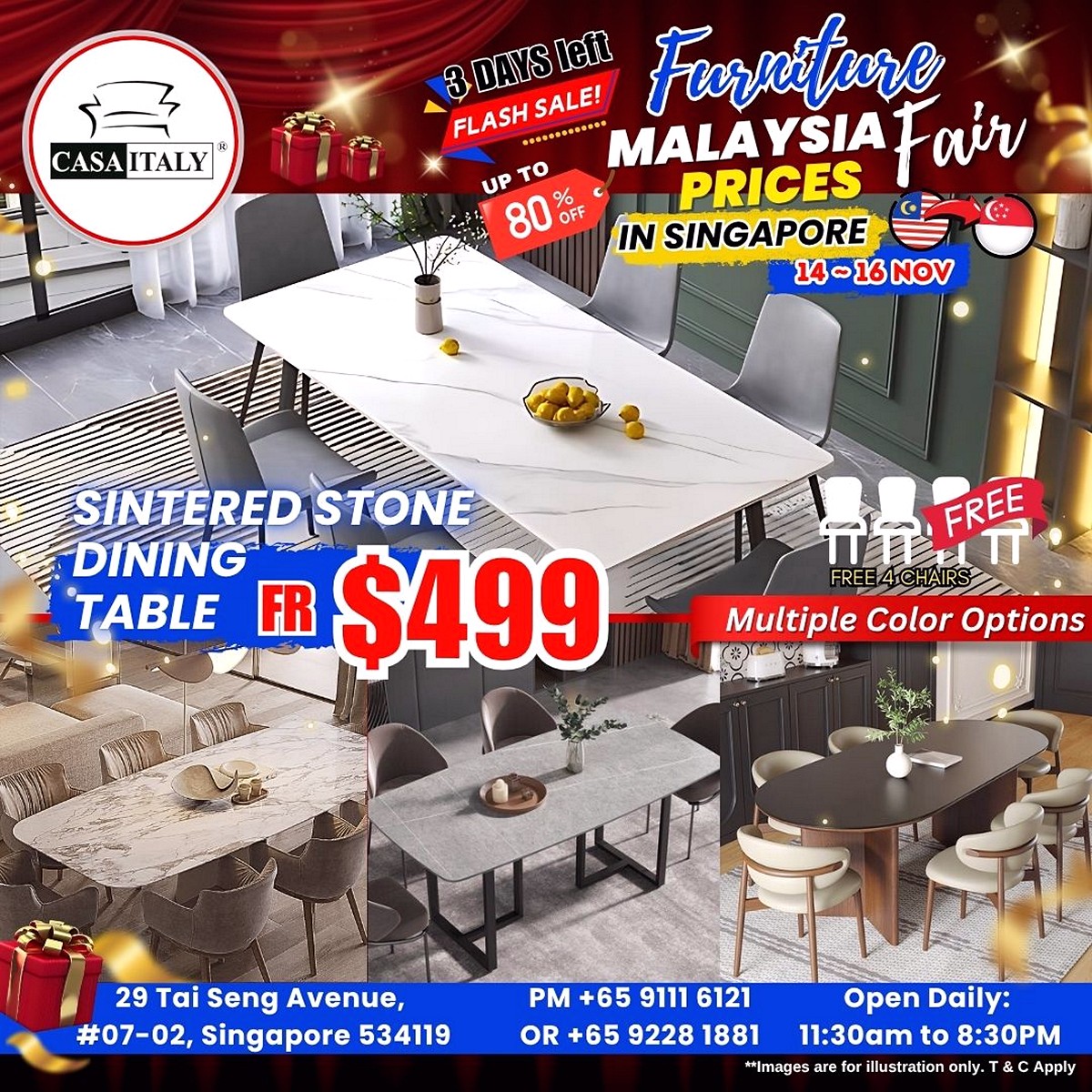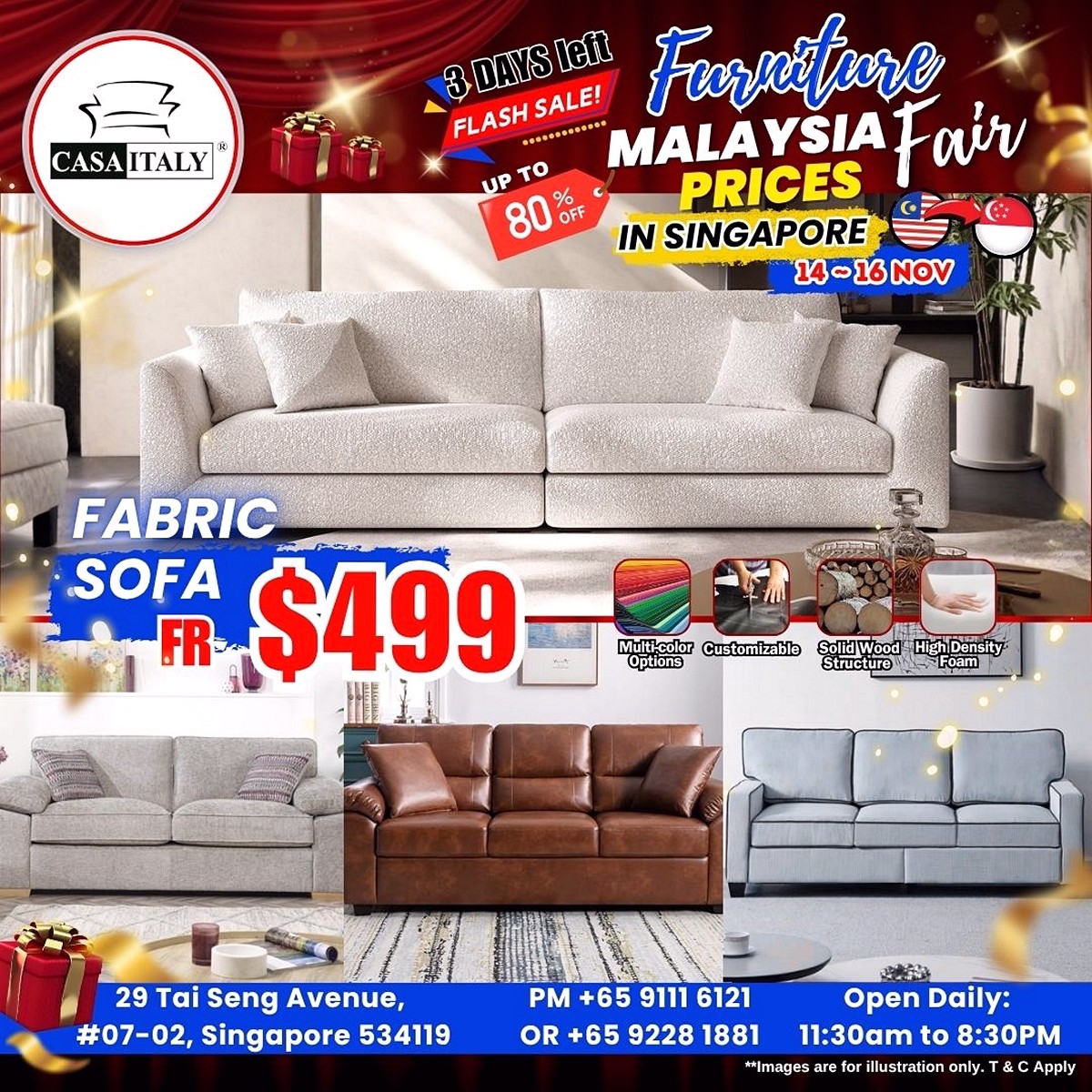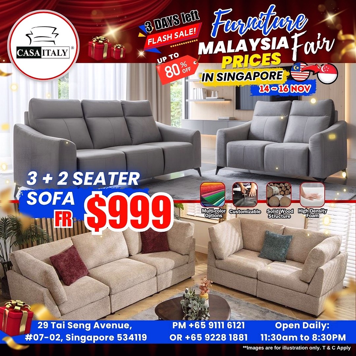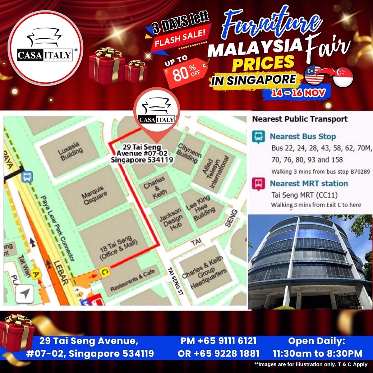 If that sounds familiar, I’ve got good news for you. CASA ITALY just saved your weekend — and your petrol money — by bringing Malaysia furniture prices straight to Singapore! From 14 to 16 November 2025, they’re holding the Furniture Malaysia Prices Fair right here at 29 Tai Seng Avenue, just a short 3-minute walk from Tai Seng MRT Exit C. No tolls, no passport stamping, no “abang please open the boot” moment.