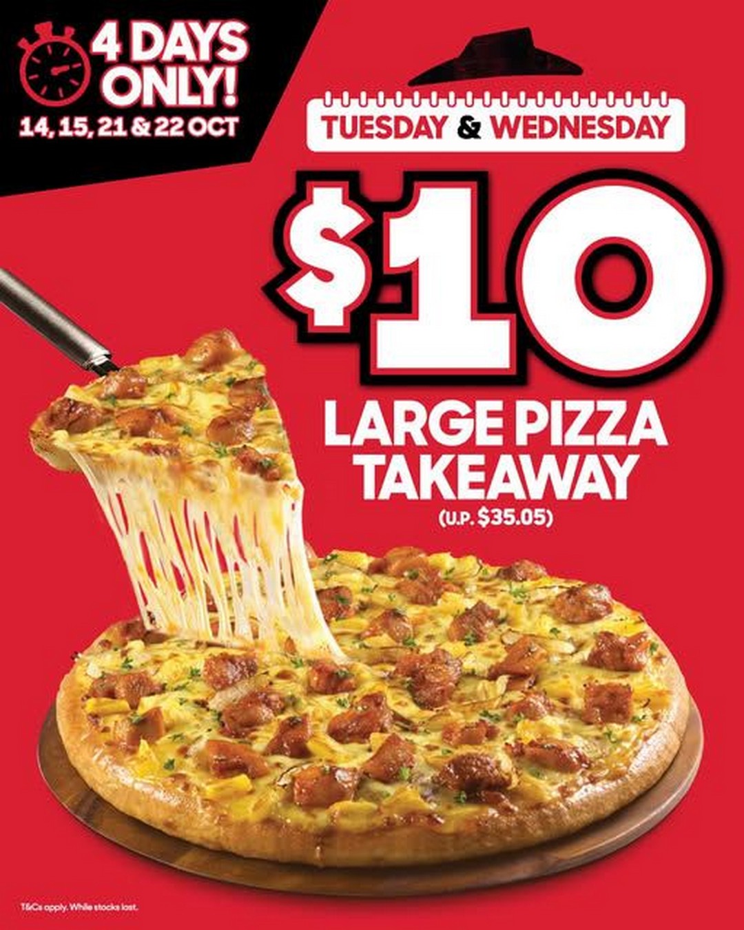 Pizza Hut is back with one of their most anticipated promotions of the year, and it’s sure to make pizza lovers’ hearts skip a beat. For four days this October, fans of the iconic pizza chain in Singapore can enjoy Large Pizzas for just $10 – a massive drop from the usual price of $35.05. Known for their deliciously cheesy, generously topped pizzas, Pizza Hut’s Takeaway Tuesday & Wednesday promotion is the perfect excuse to indulge in a satisfying meal without burning a hole in the wallet.