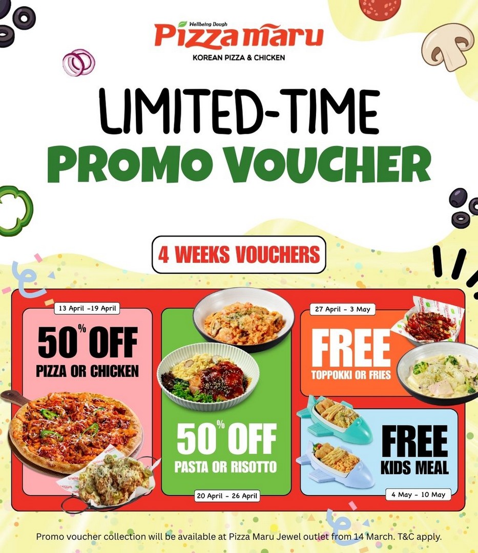 The first part of the promotion is straightforward. Diners head down to Pizza Maru at Jewel before 23 March 2026, enjoy a meal, and receive free vouchers.