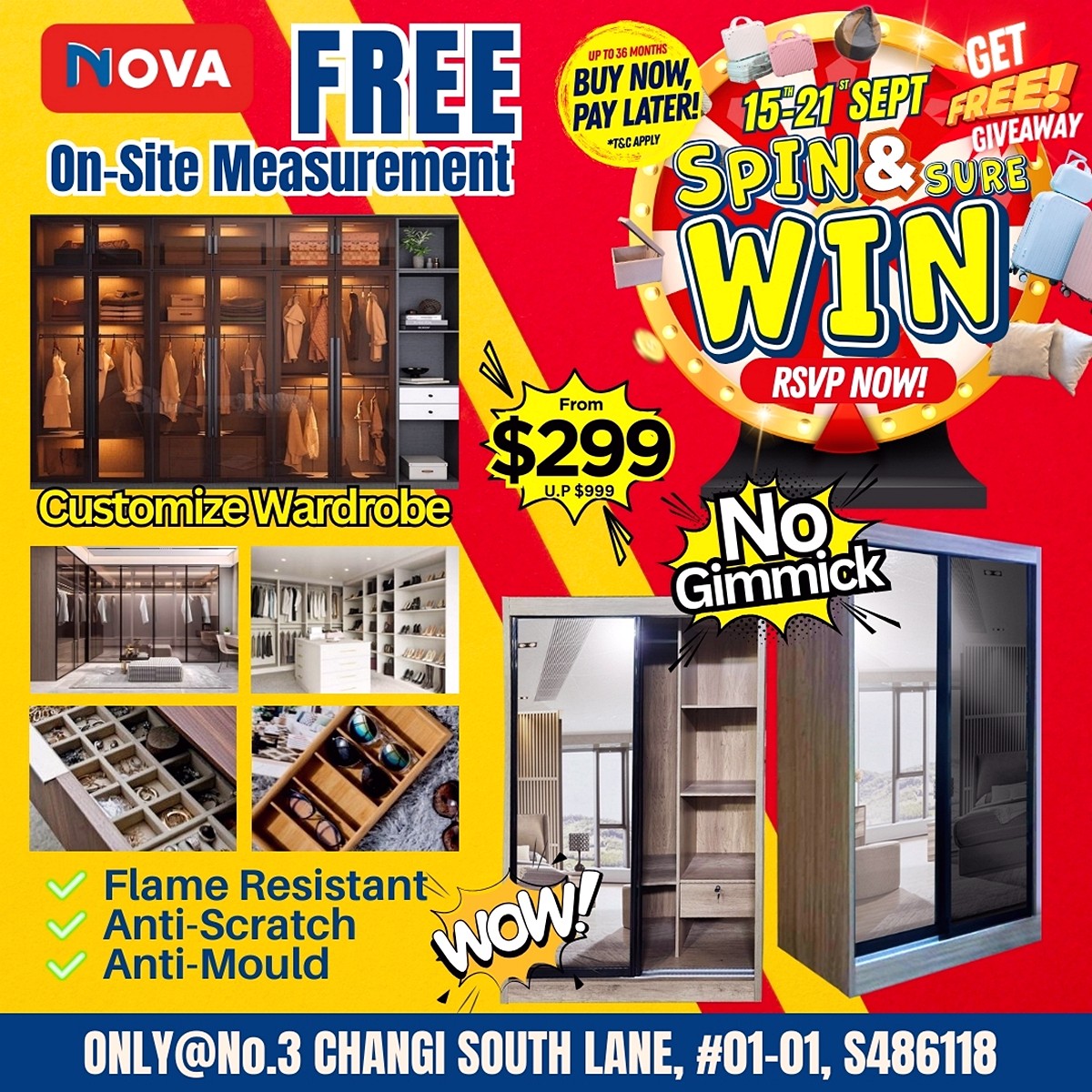 If you’ve ever tried squeezing a “standard size” wardrobe into an HDB room, you know it’s like trying to fit a piano into a lift. NOVA’s solution? Custom wardrobes from $499, with free on-site measurement.
