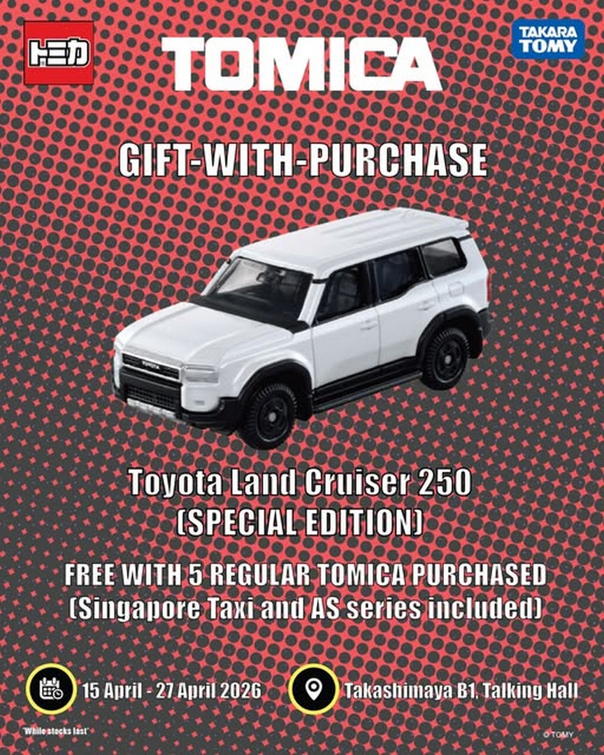 From 15 to 27 April 2026, TOMICA Singapore is running a Gift-With-Purchase campaign at Takashimaya Department Store B1 Talking Hall. The highlight of this campaign is a special free gift that stands out even among seasoned collectors: a Toyota Land Cruiser 250 (Special Edition) model. It is available as a gift when shoppers purchase 5 regular TOMICA cars in a single receipt.