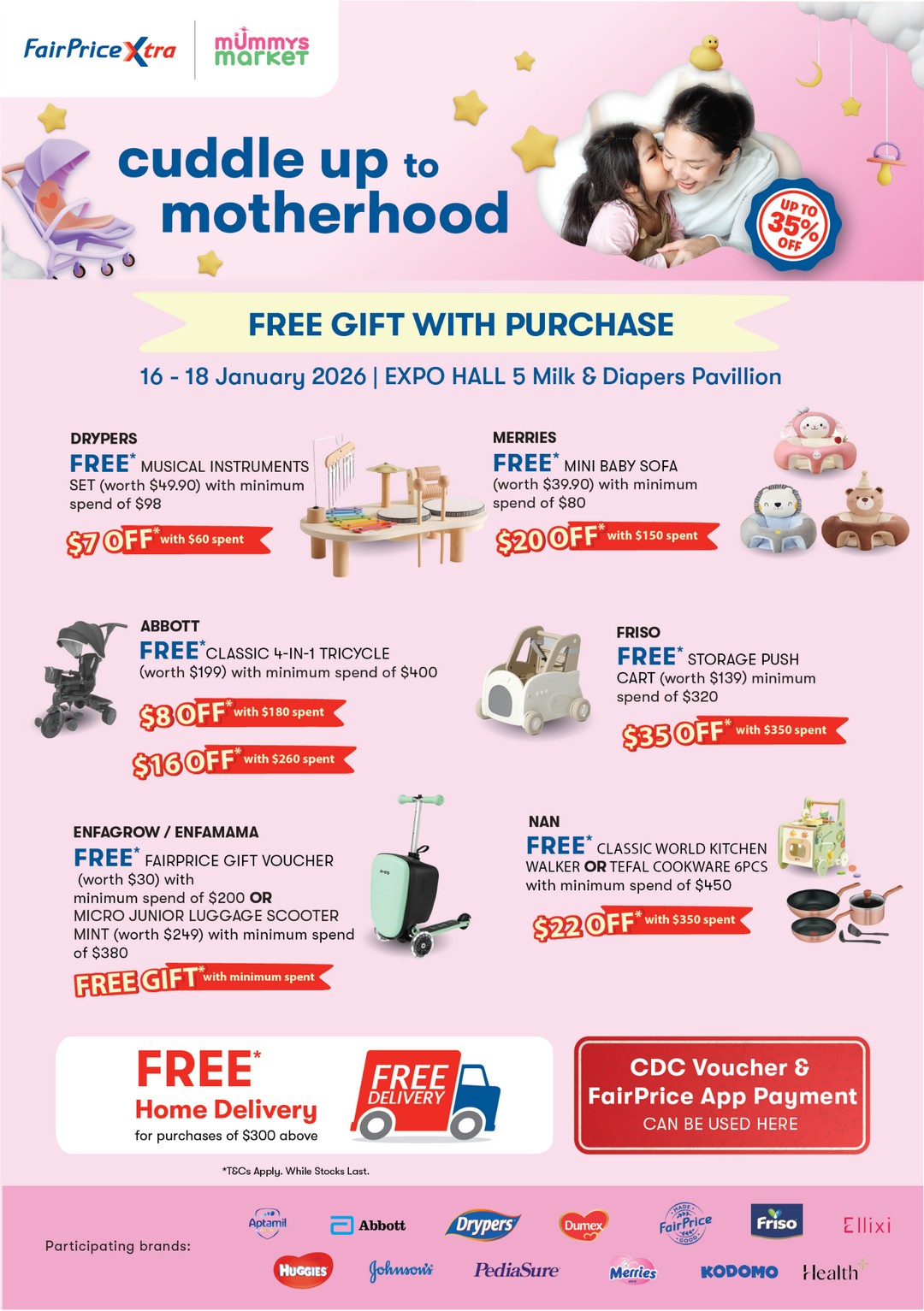 Free gifts available while stocks last; selected purchases enjoy free home delivery with minimum spend. CDC Vouchers, SG60 Vouchers, and FairPrice app payments accepted.