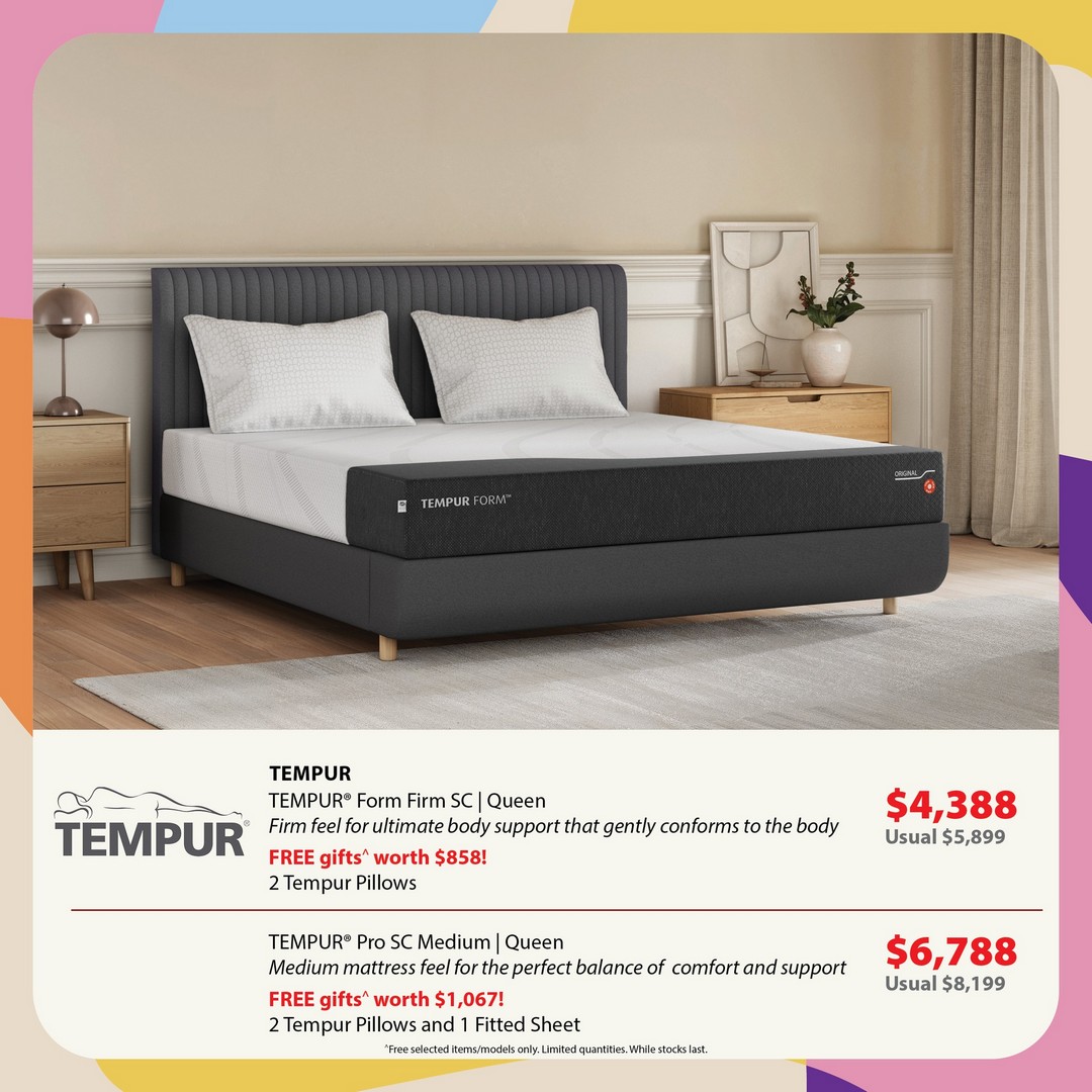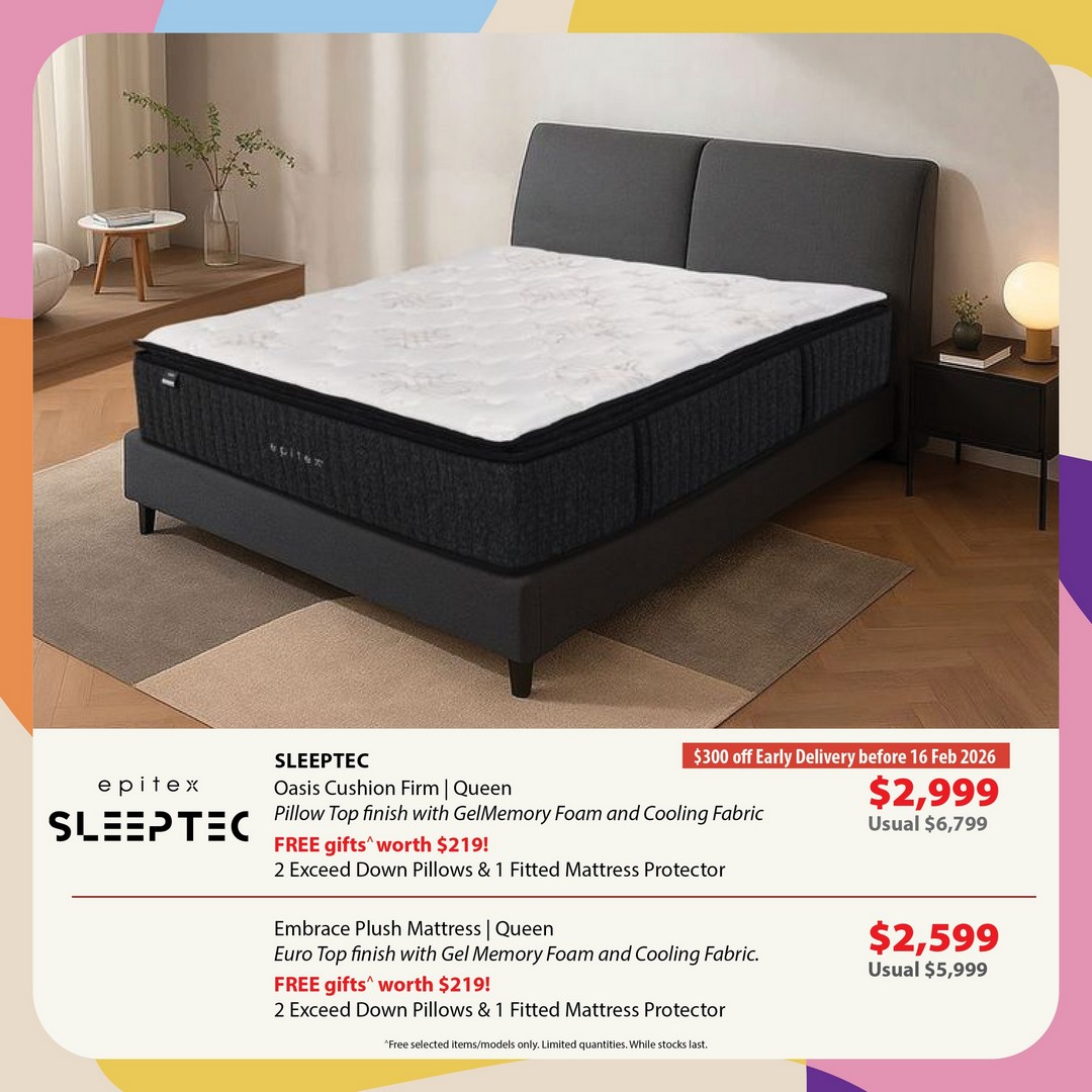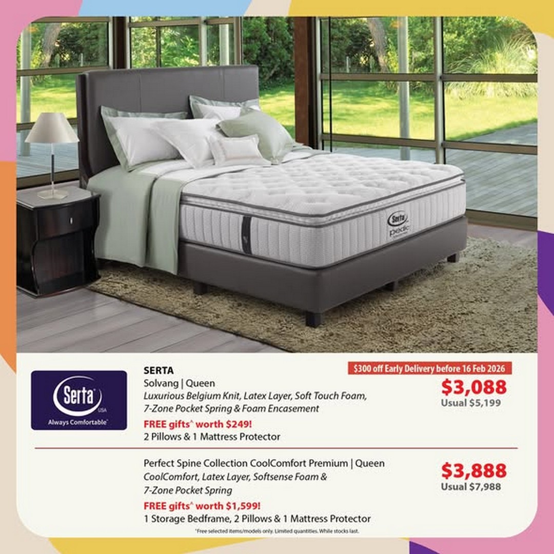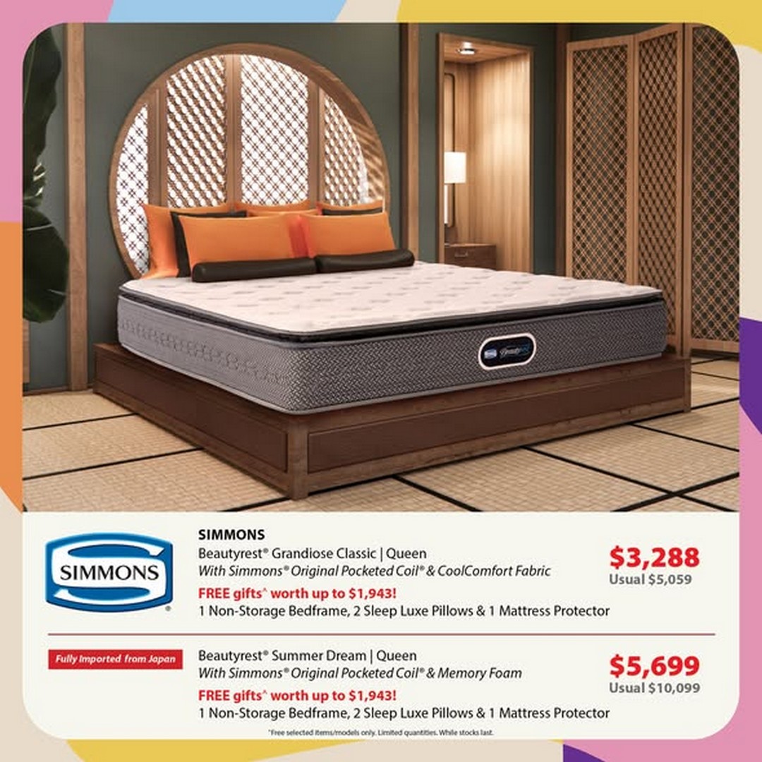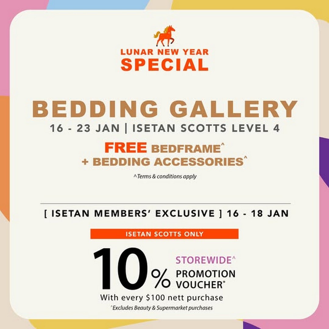 Perks: Free bedframe & bedding accessories with purchase, Isetan Members receive 10% Storewide Promotion Voucher for every $100 nett purchase from 16–18 Jan