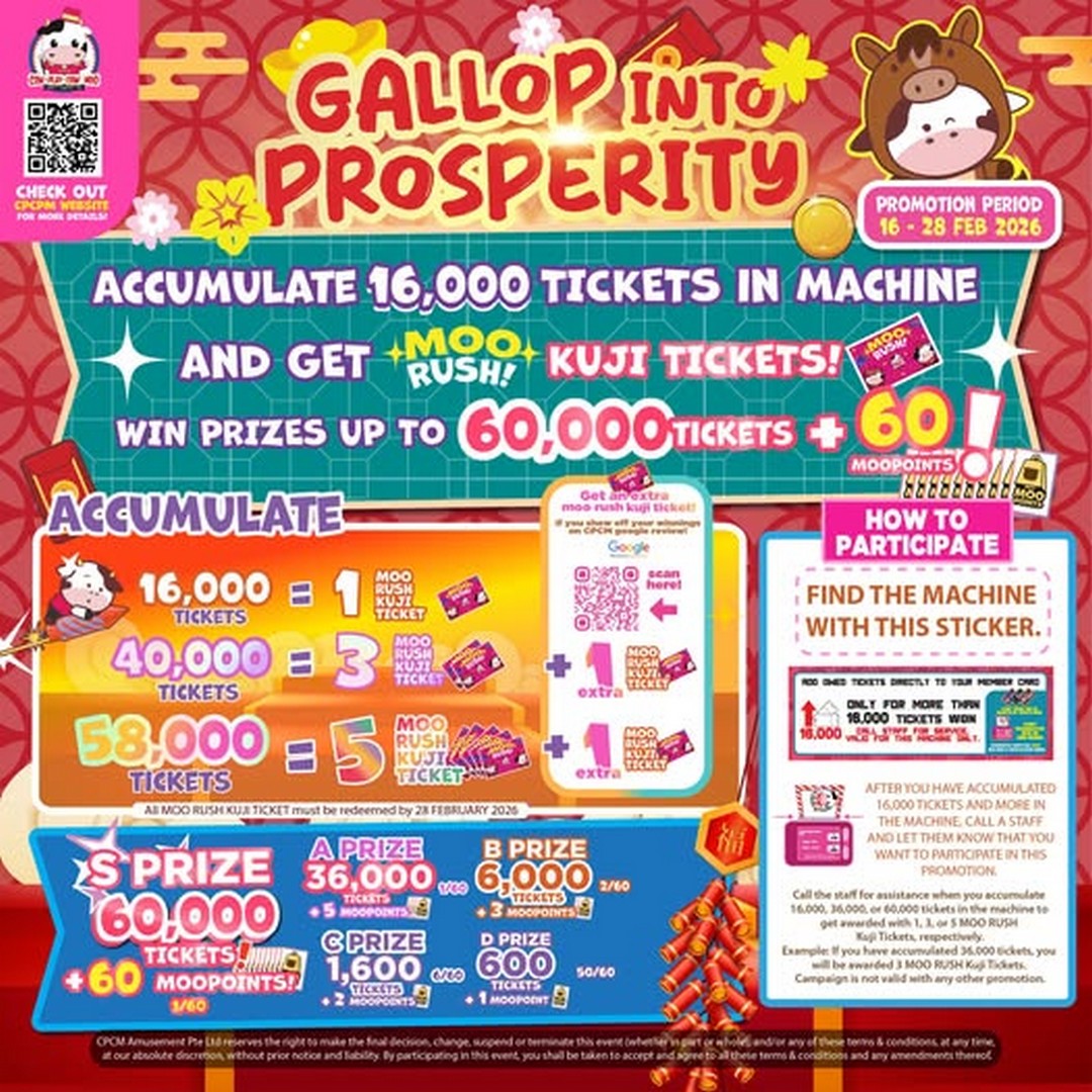 Arcade lovers in Singapore always keep an eye out for promotions that stretch their hard-earned tickets a little further. From 16–28 February 2026, Cow Play Cow Moo is bringing back the excitement with their Gallop into Prosperity Ticket Kuji Promotion, and this one is not just about stacking tickets – it is about turning those tickets into even bigger rewards.