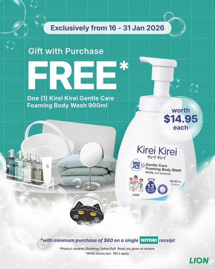 Looking for a little retail therapy in Singapore that not only refreshes your home but also treats your family? Nitori Singapore has just the deal to brighten up the start of your year. Between 16 and 31 January 2026, shoppers who spend a minimum of $60 in a single Nitori receipt can receive a FREE Kirei Kirei Gentle Care Foaming Body Wash (900ml) worth $14.95.