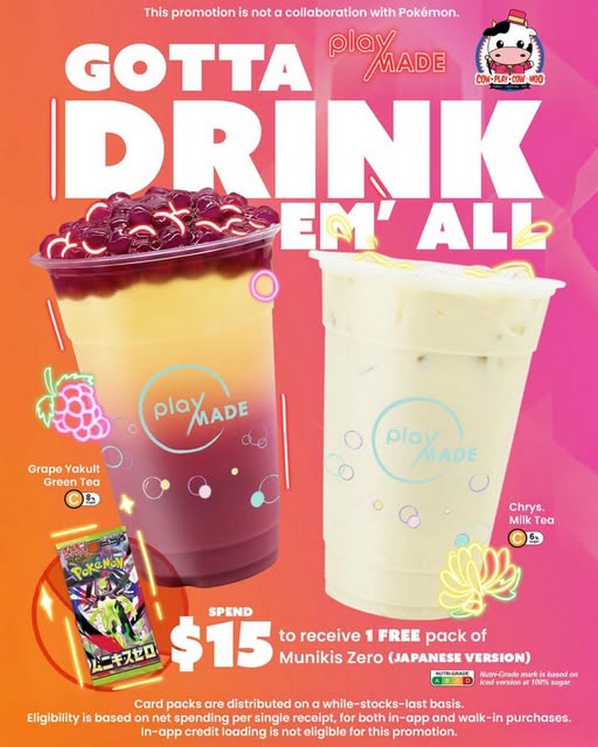 Starting from 16 April 2026, PlayMade is rolling out a limited-time giveaway that blends the joy of bubble tea with the thrill of collectible card hunting. Customers who spend a minimum of $15 in a single transaction will receive a complimentary pack of Pokémon cards – specifically the Munikis Zero Japanese version. It sounds simple enough at first, but there is a twist that makes it genuinely exciting: there are no guarantees, no repeats promised, and absolutely no hints on what is inside each pack.