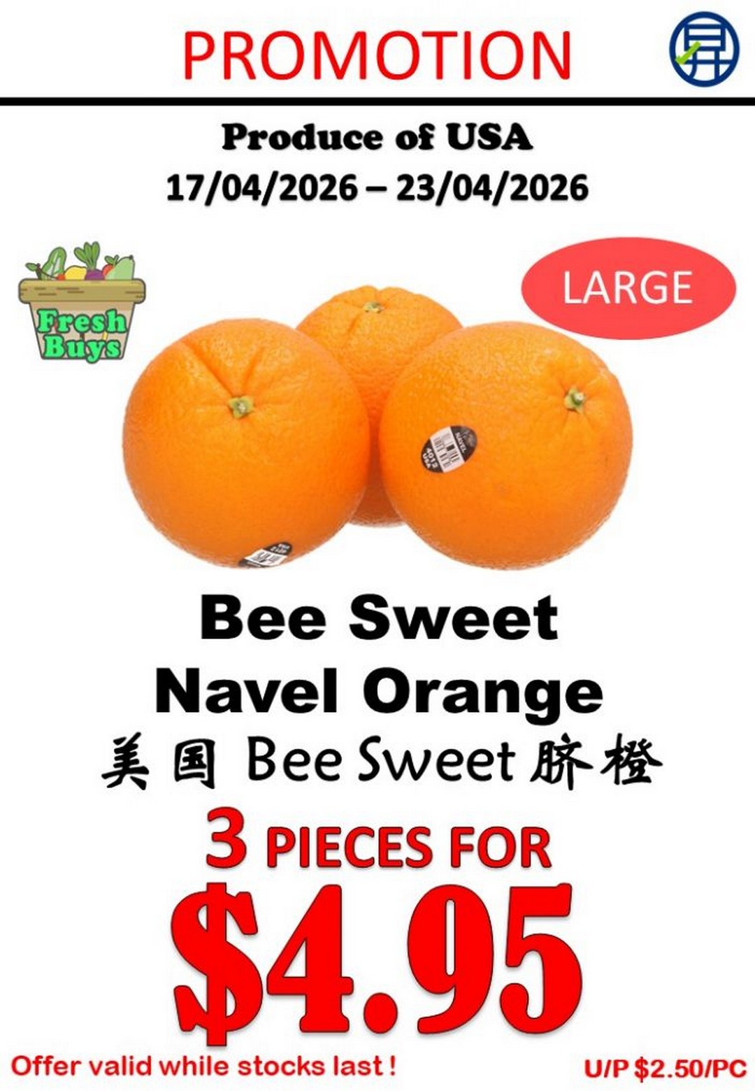 The USA Bee Sweet Navel Oranges (large) are priced at 3 pieces for $4.95. These oranges are known for their juiciness and are ideal for juicing or eating fresh as a vitamin C boost.