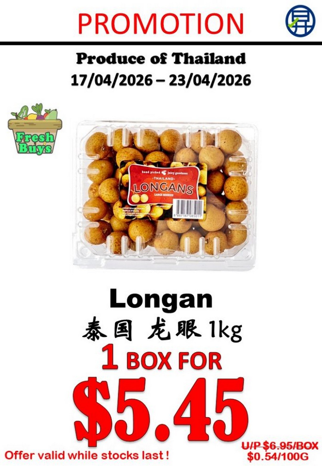 The Thailand Longan (1kg box) is priced at $5.45, offering a sweet and juicy option that is perfect for sharing. Longans are often enjoyed chilled, making them a refreshing treat in Singapore’s warm weather.