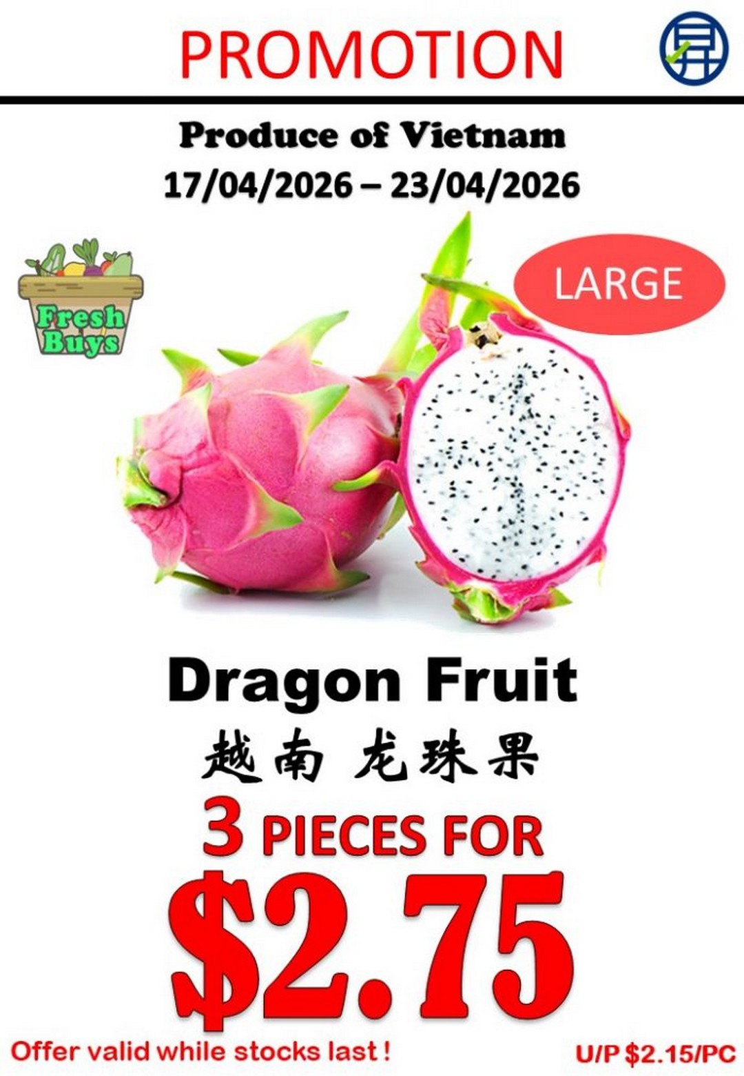 Vietnam’s Large Dragon Fruit is going at 3 pieces for $2.75. Dragon fruit is not only visually striking but also packed with fibre and antioxidants, making it a popular health-conscious choice.