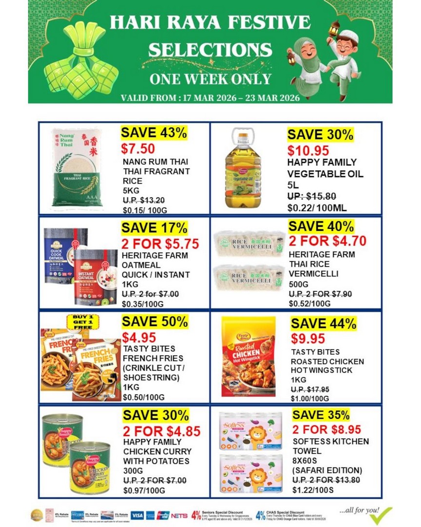 Don’t miss the chance to celebrate Hari Raya with abundance and joy, while keeping your spending in check. Whether it’s the staples, festive snacks, or treats for your loved ones, Sheng Siong ensures that the season is both enjoyable and affordable. Mark your calendars and head down to your nearest outlet from 17 to 23 March 2026 to make the most of this festive offer.