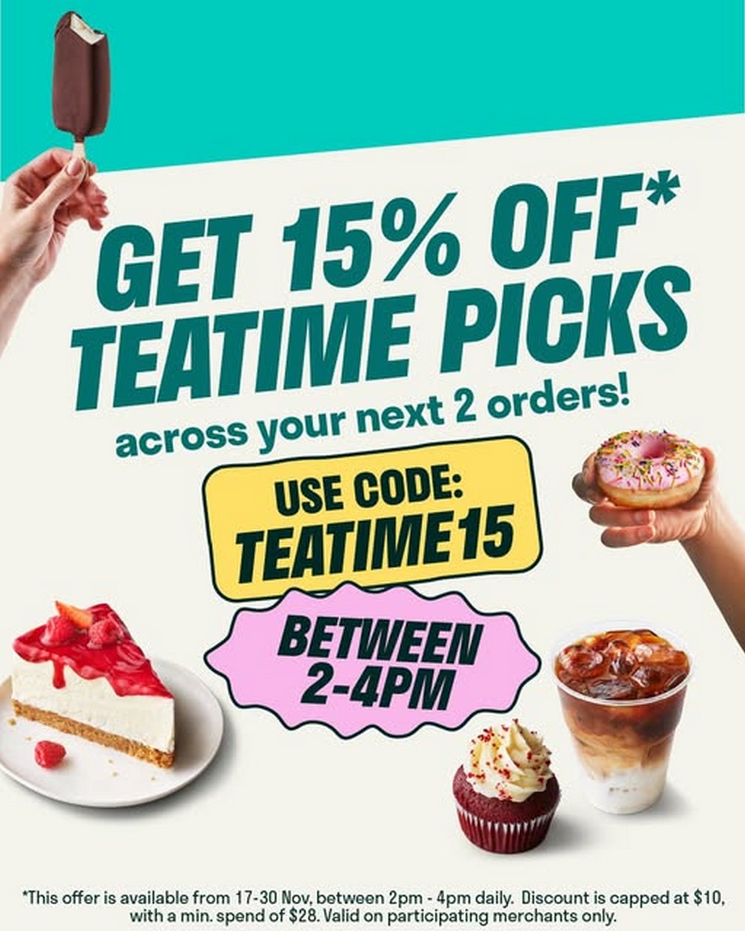 From 17 to 30 November 2025, Deliveroo is offering 15% off on selected teatime snacks and drinks across your next two orders, provided you spend a minimum of $28 per order. The promotion runs daily between 2 pm and 4 pm, which is perfectly timed for anyone looking for a pick-me-up during the mid-day lull. Whether it’s a quick cup of coffee, a refreshing bubble tea, or a sweet pastry, this promotion makes it more affordable to indulge in your favourite teatime treats without guilt.