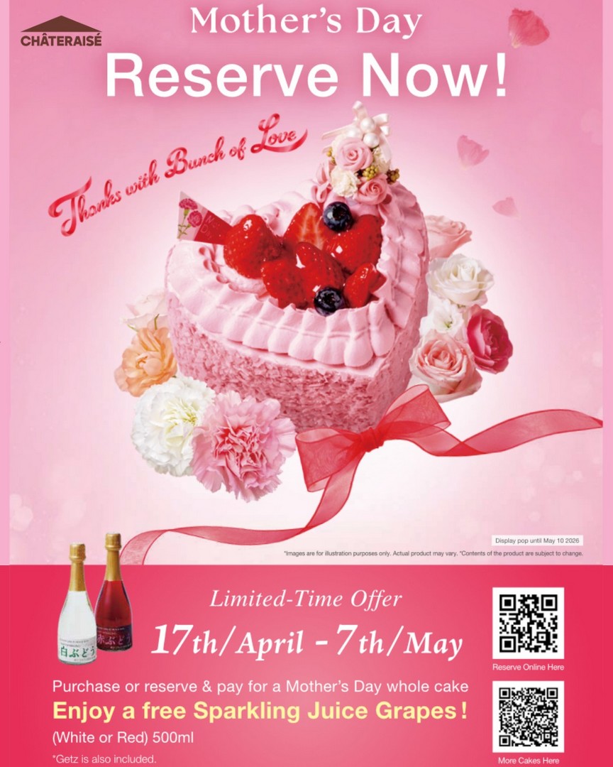 From 17 April to 7 May 2026, customers in Singapore who pre-order and pay for any Châteraisé Mother’s Day whole cake will receive a complimentary bottle of Sparkling Juice Grapes (500ml), available in either white or red grape flavour. It is a simple gesture, but one that adds a refreshing touch to an already meaningful celebration.