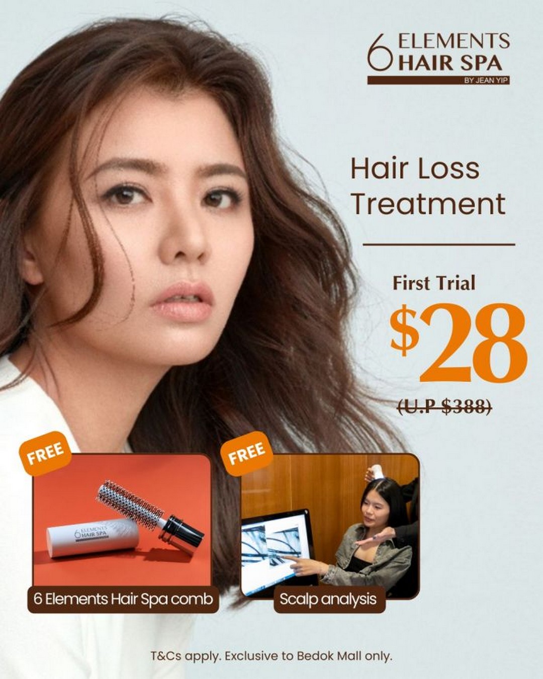 For anyone who has been looking to address hair loss without breaking the bank, here’s a deal that demands attention. 6 Elements Hair Spa by Jean Yip at Bedok Mall is rolling out an exclusive promotion that makes professional hair loss treatment more accessible than ever. Their first trial hair loss treatment is now available for only $28, a significant drop from the usual price of $388. On top of that, this promotion comes with thoughtfully curated freebies that enhance the experience and add tangible value for customers.