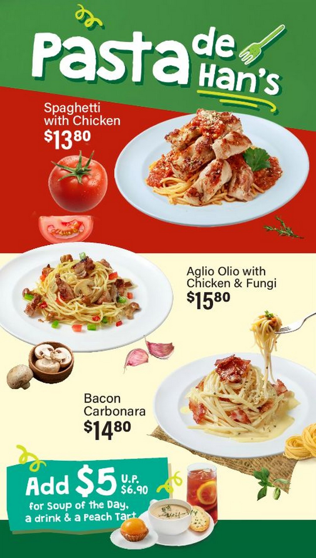 Dining at Han’s has always been about value, but this time they are taking it a step further. For just $5 (U.P. $6.90), diners can add on a Soup of the Day, a drink, and a Peach Tart to accompany their pasta.