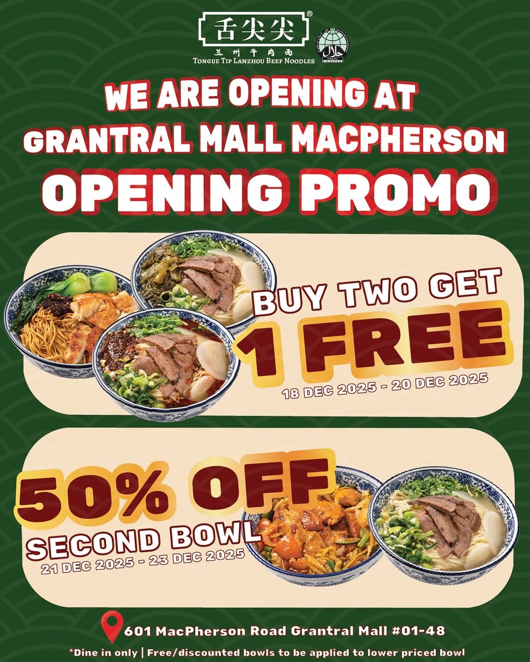 Singapore food lovers have another reason to get excited this December. Tongue Tip Lanzhou Beef Noodles, a celebrated name for its authentic hand-pulled noodles and rich beef broth, is officially opening its doors at Grantral Mall Macpherson. To mark this special occasion, they are rolling out a series of opening promotions that promise both flavour and value—a perfect combination for anyone who loves hearty meals without breaking the bank.