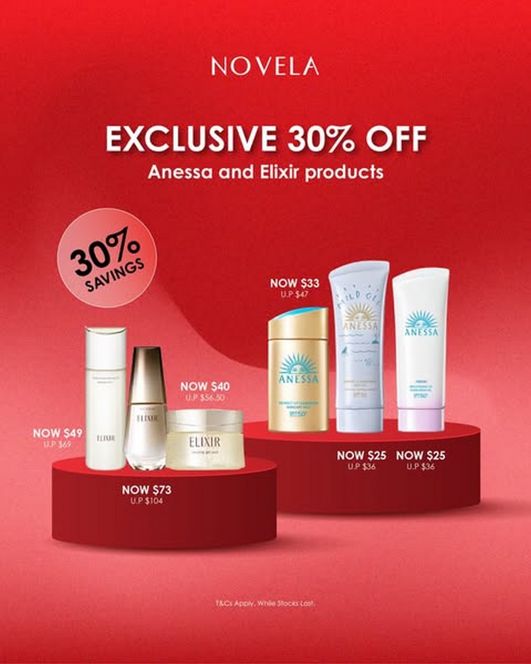 Sun protection and skincare lovers will also be thrilled with the 30% off on Anessa and Elixir products. These brands are celebrated for their effective sun protection formulas and skin-enhancing products. Whether it’s a protective sunscreen for everyday use or a nourishing serum to revitalise your complexion, Novela has it covered.