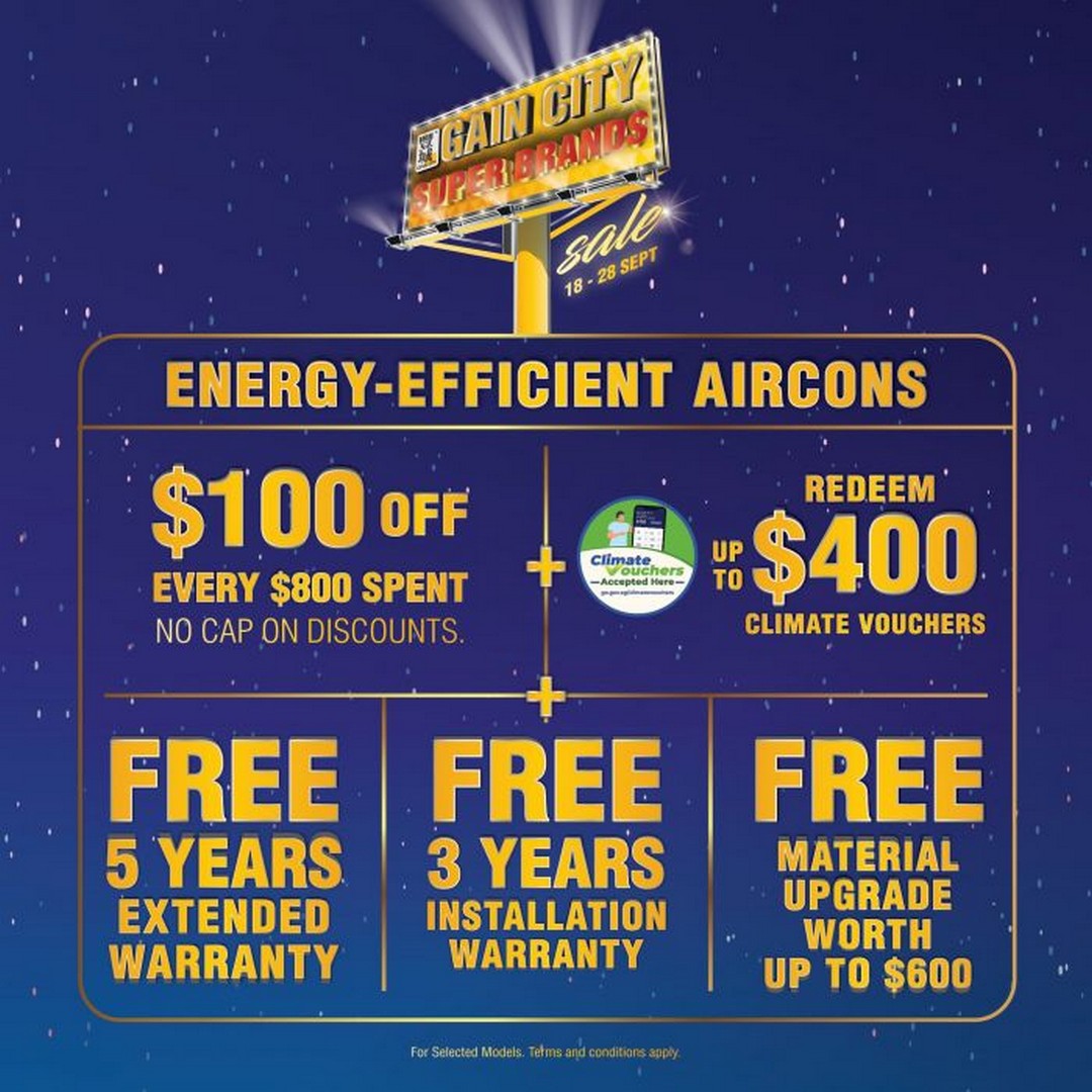 Gain City’s Super Brands Sale is well-known for its straightforward yet generous offers. Shoppers will enjoy $100 off for every $800 spent, and the best part is there’s no cap. This means the more they spend, the bigger the discount. For example, a purchase of $3,200 instantly saves $400, and if they are investing in larger household systems, the savings stack up quickly.
